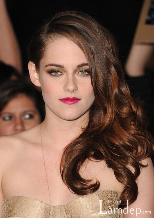 Sự thật đây là cách trang điểm kết hợp tuyệt vời cho một buổi tiệc đêm, ở đây, Kristen Stewart chọn đôi môi màu hồng đậm và phần trang điểm măt khá tỉ mỉ. Bắt đầu với bầu mắt màu gold cho tới khóe mắt trong và hoàn thành phần khóe mắt ngoài với màu nâu lấp lánh.