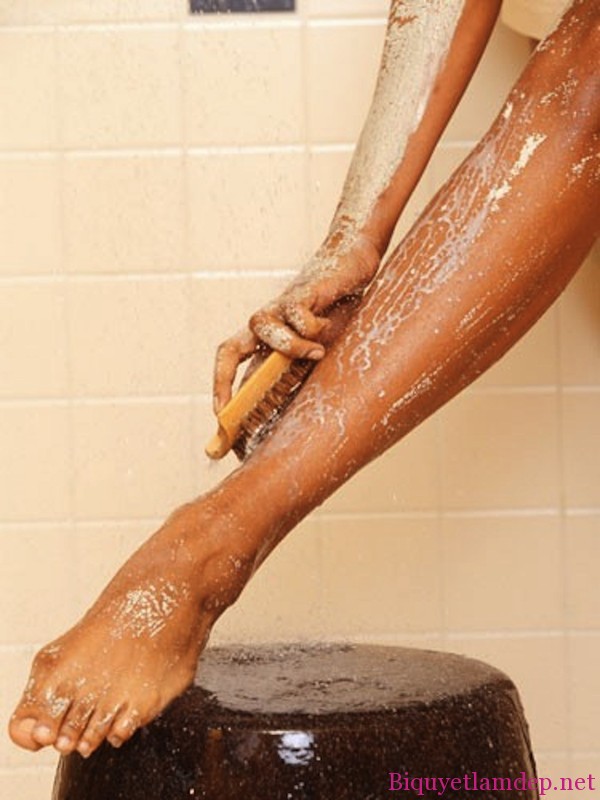 Sử dụng một hòn đá mài, hoặc một miếng bông tắm kì nhẹ vào vùng da đầu gối của bạn trong lúc tắm. Việc loại bỏ tế bào chết thường xuyên sẽ giúp làm mềm làn da thô và da sẽ sáng hơn. Chuẩn bị hỗn hợp gồm hai thìa cafe bột, 1/2 thìa muối biển hoặc đường nâu, 1/2 thìa dầu olive hay dầu vừng. Chà xát hỗn hợp này với miếng bông tắm của bạn, các tế bào chết sẽ được loại bỏ dần dần, nhờ đó vùng da tối màu sẽ trở nên mềm mại và sáng hơn.