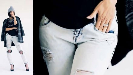 Với tông mũ màu xám, bạn nên chọn quần jeans bạc. Thêm vào đó, hãy tô điểm với những chiếc vòng cổ bạc để tăng thêm "chất" cho trang phục. Jeans bạc với những đường xẻ vải cá tính. Thêm một đôi giầy cao gót với dây buộc kim loại phía sau.