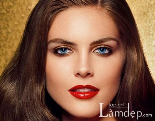 Trang điểm môi: Dùng chì viền môi cùng tông với màu son để tạo hình cho khuôn môi. Thoa son môi bằng cọ để son được đều màu và phủ thêm một lớp nhũ.
