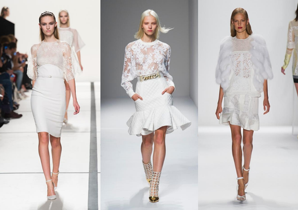 Chất liệu ren tinh tế tiếp tục đổ bộ sàn diễn năm nay với gam trắng thanh nhã, pastel ngọt ngào hay gợi cảm cùng xuyên thấu.