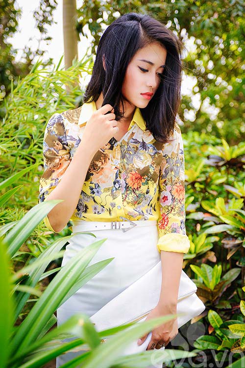 Áo màu trắng hoặc áo đơn sắc nhã nhặn luôn dễ dàng bắt cặp cùng quần in hoa. Đây được coi là cách kết hợp đơn giản, không tốn thời gian và an toàn, thanh lịch nhất.
