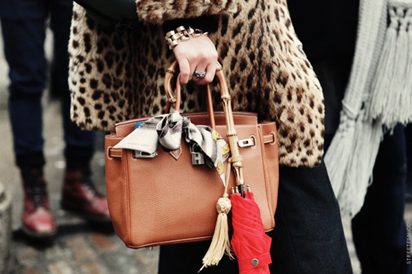 Tận dụng khăn để trang trí túi, giúp phụ kiện này trở thành điểm nhấn độc đáo. Dễ áp dụng nhất là túi đơn sắc, chúng sẽ quý phái và đẳng cấp hơn khi đi kèm khăn lụa phù hợp.