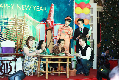 | Du khách nước ngoài thích thú làm bánh truyền thống trong ngày Tết Nguyên đán của Việt Nam. |