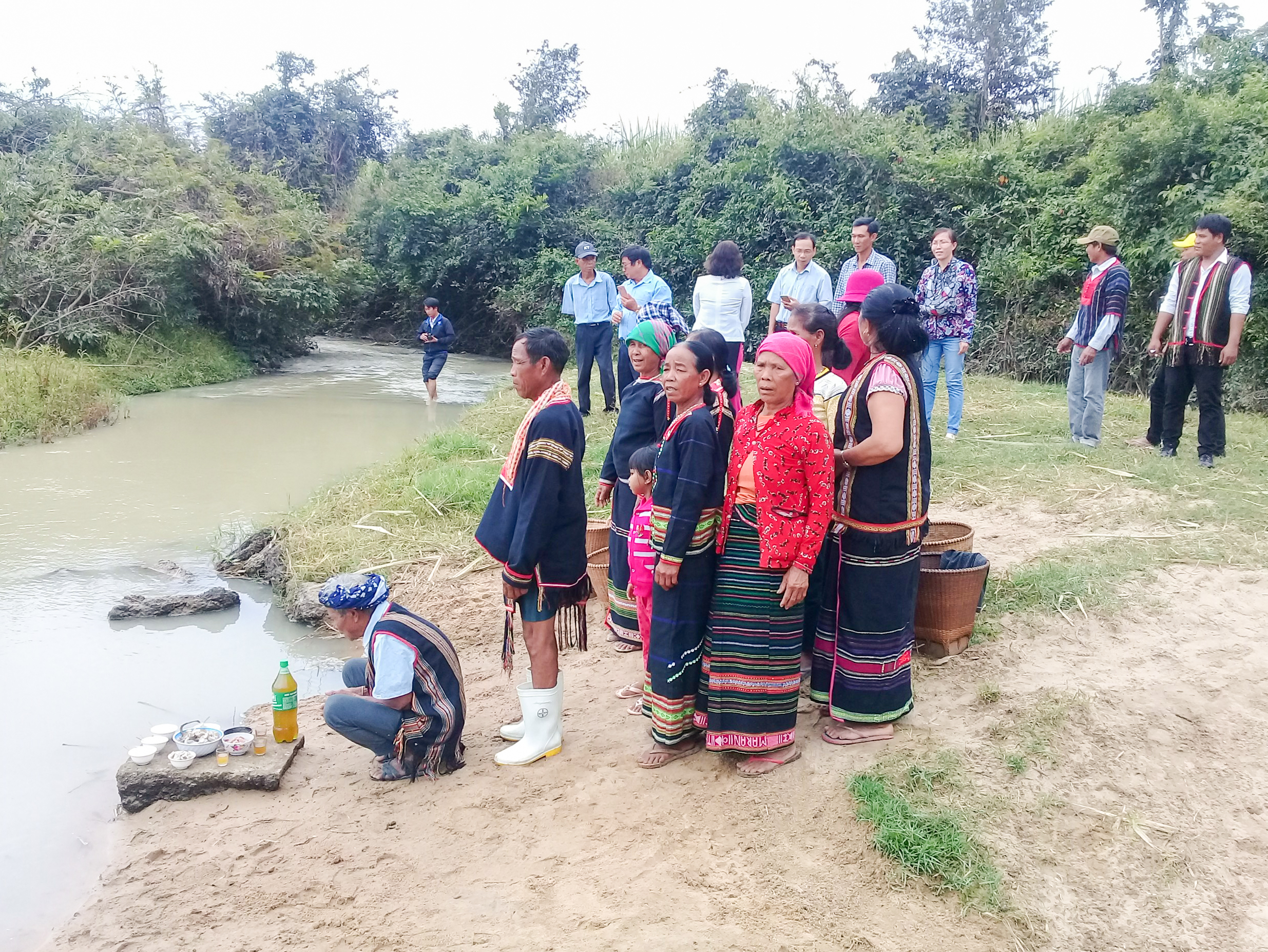 | Dân làng và du khách dự Lễ cúng bến nước tại Buôn Lác, xã Ninh Tây. |
