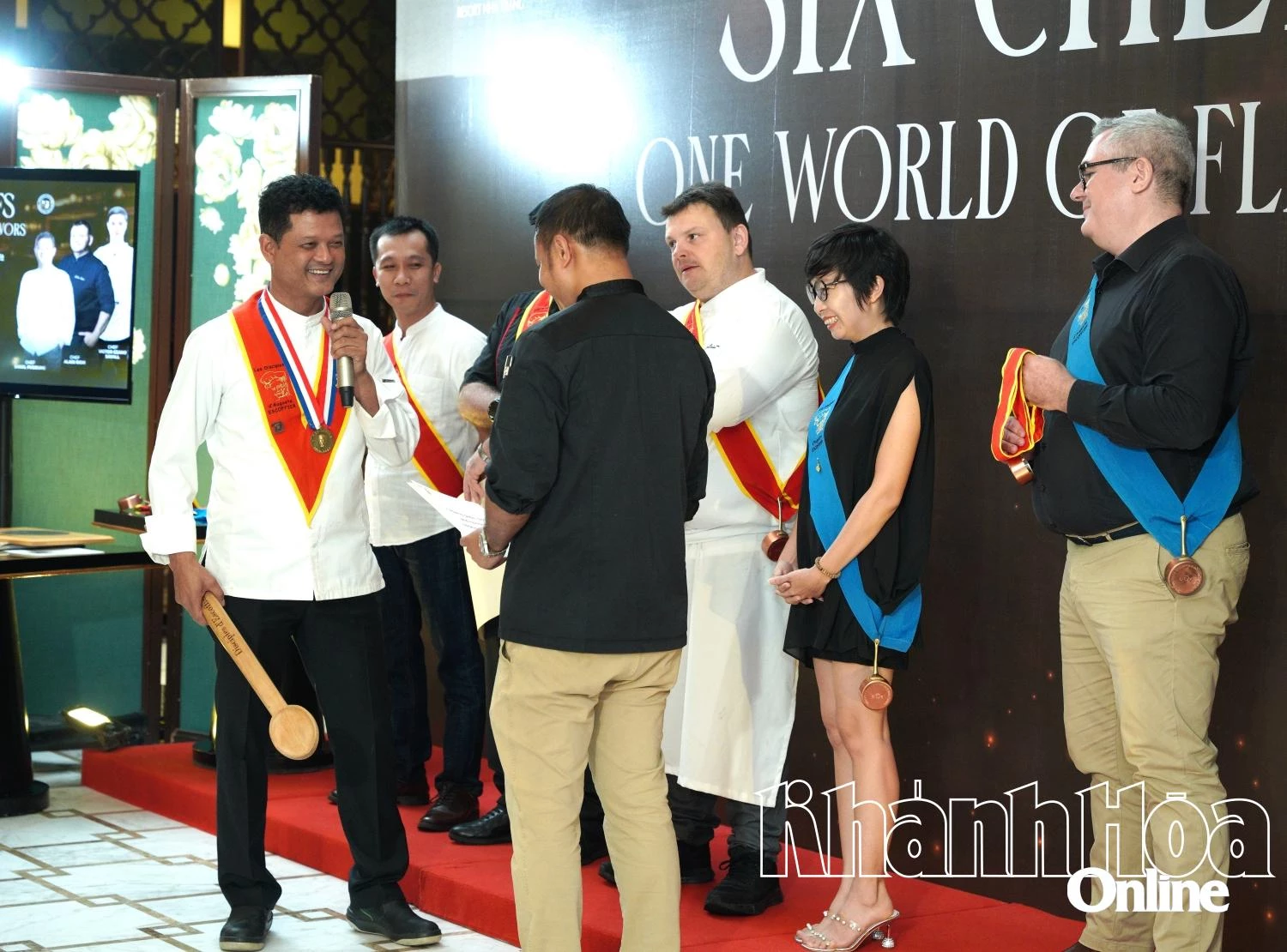 | Chủ tịch Hiệp hội Escoffier Việt Nam Sakal Phoeung thực hiện các nghi thức để kết nạp bếp trưởng Azizkandar Awang vào hiệp hội. |
