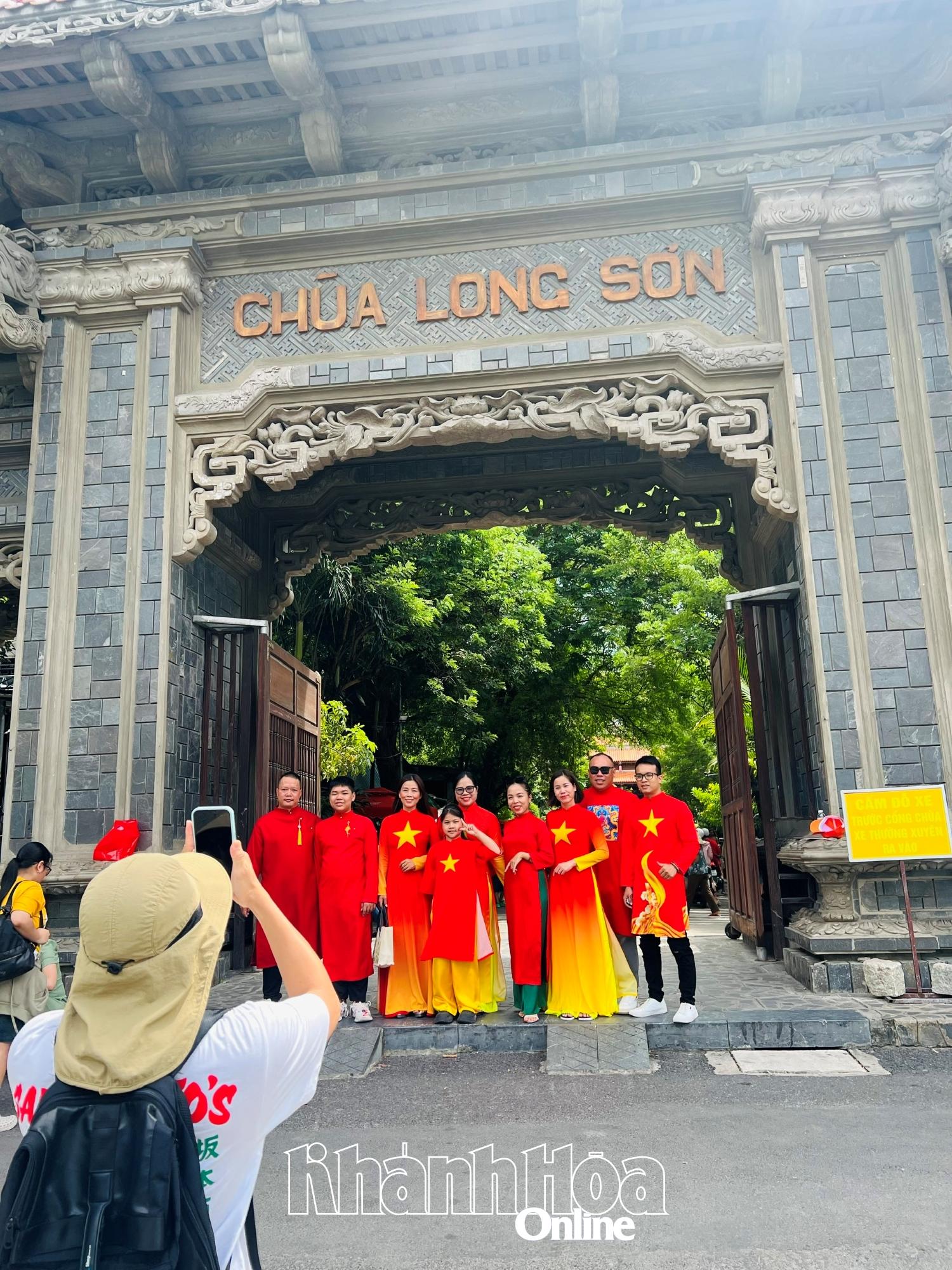 | Khách du lịch chụp ảnh lưu niệm khi tham quan chùa Long Sơn, phường Tây Nha Trang, Khánh Hòa. |