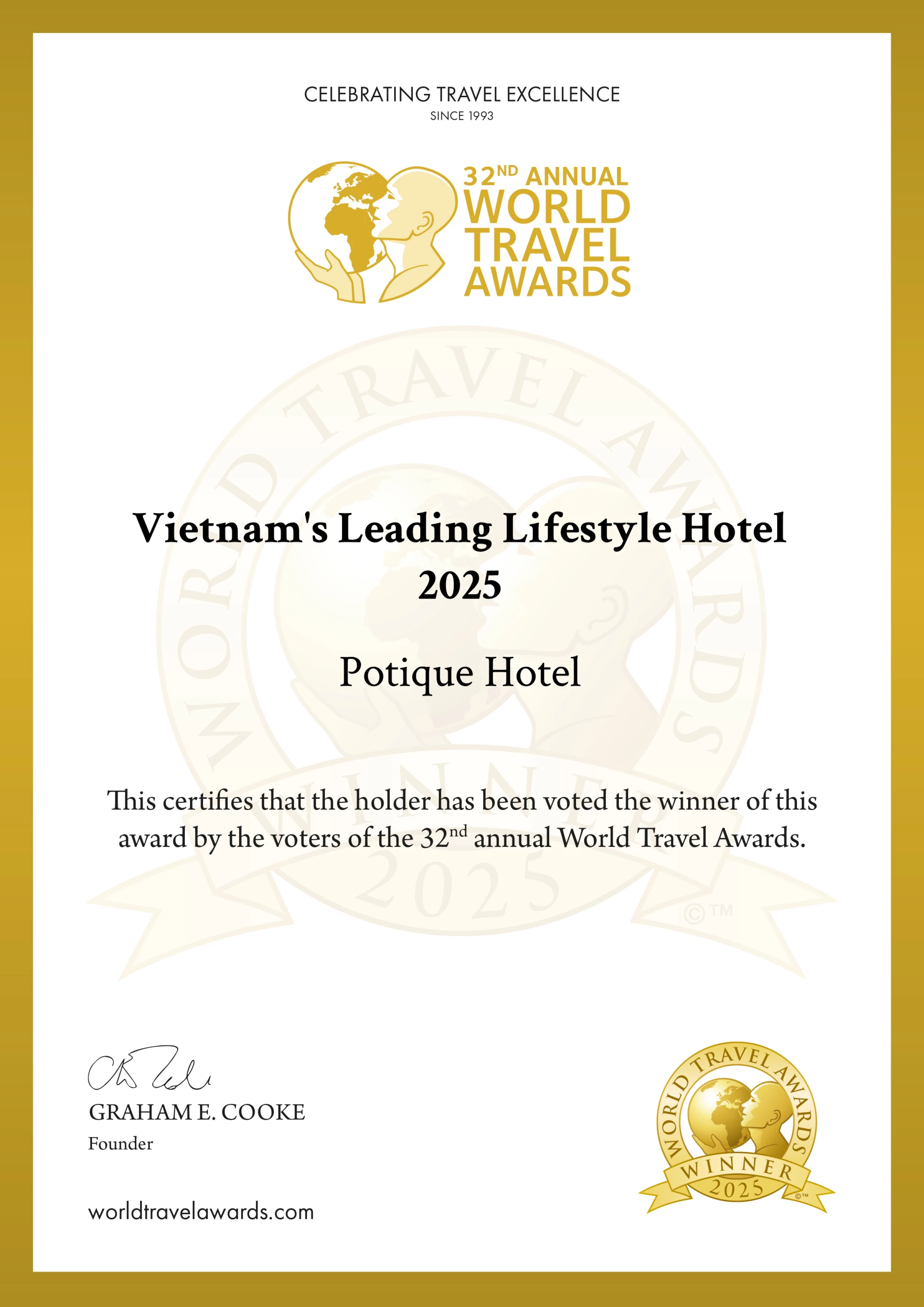 Trước khi nhận giải thưởng của WTA, Potique cũng đã nhận được nhiều giải thưởng uy tín khác trong năm 2025 như Travel + Leisure Luxury Awards Asia Pacific, Haute Grandeur Global Awards, Tripadvisor Travelers’ Choice Awards, World Luxury Hotel Awards…