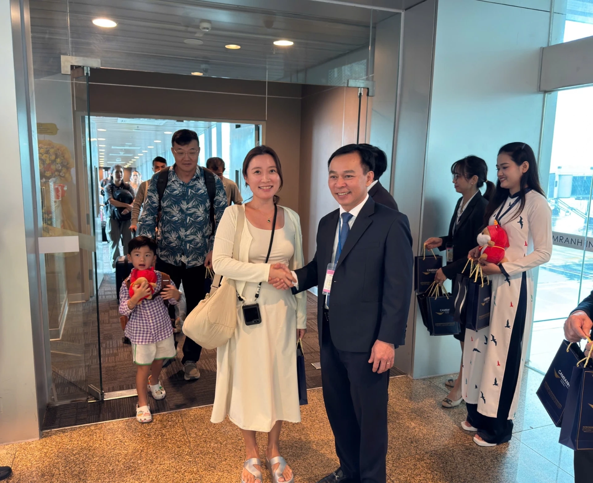 | Lãnh đạo Trung tâm Xúc tiến Đầu tư, Thương mại và Du lịch Khánh Hòa chào đón du khách bay từ Singapore. |