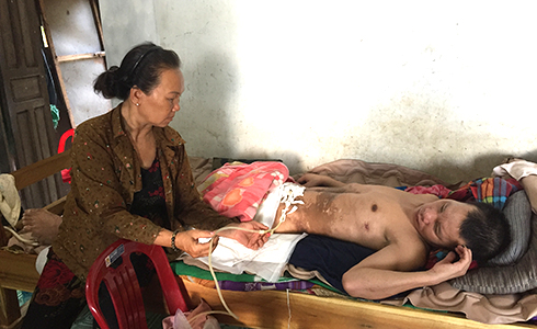“Since Ho became paralyzed, I and my husband have taken turns to look after him. We are also taking care of our two grandchildren, Ho’s daughters. We carry Ho to Ninh Hoa General Hospital by ambulance to change the urinary catheter around three to four times per month, which costs us VND500 thousand per time. We are old now, so it is difficult for us to earn money to help my son. Our only wish now is that we can afford to carry him to Ho Chi Minh City for a better treatment,” said Nguyen Thi Hai, Ho’s mother (born in 1958).