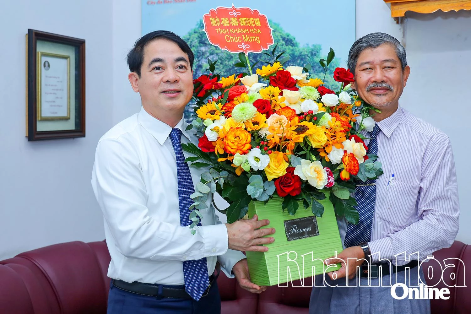 | Provincial Party Secretary Nghiem Xuan Thanh presents greeting flowers to a representative of Nhan Dan Newspaper in Khanh Hoa Province. |