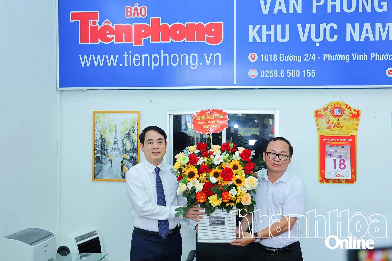 | Provincial Party Secretary Nghiem Xuan Thanh offers greeting flowers to the leader of the representative office of Tien Phong Newspaper of the Southern Central Region. |