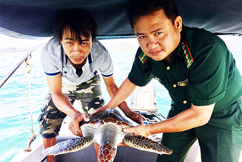 A sea turtle was released into the wild on April 17 by representatives of Van Ninh District Fisheries Resources Station, Van Hung Border Station and a fisherman named Nguyen Kia in Tan Duc Dong Village, Van Luong Commune, Van Ninh District.