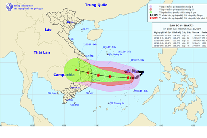 In the next 24 hours, the storm will head west at 10-15kph. At 1a.m, the storm will be at 12.9 °N and 110.9°E, 190km off the coast of the central provinces of Quang Ngai – Khanh Hoa.