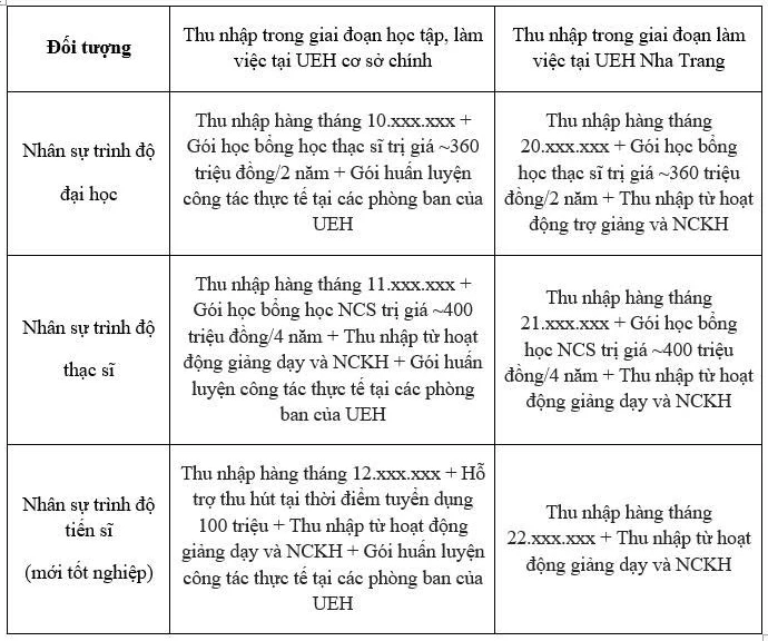 - Được hưởng thu nhập tăng thêm từ UEH theo chế độ dành cho nhân sự của UEH Nha Trang.
