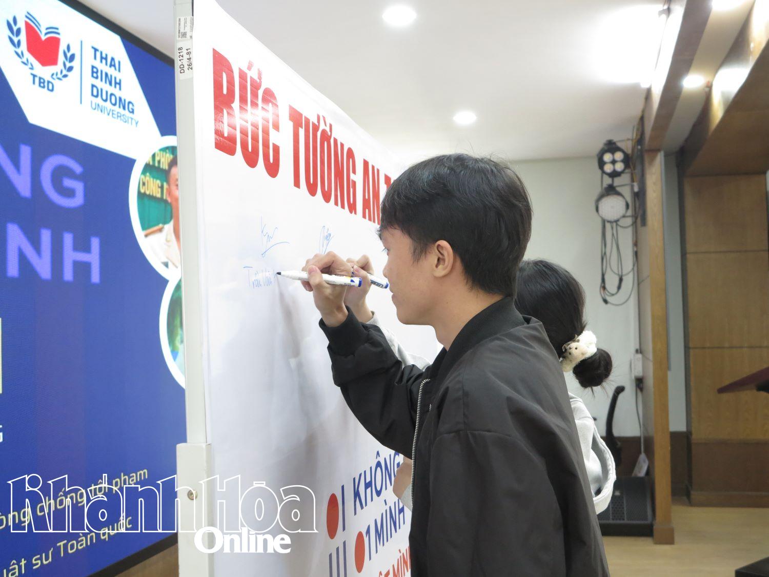 | Sinh viên ký cam kết tại "Bức tường an toàn số". |