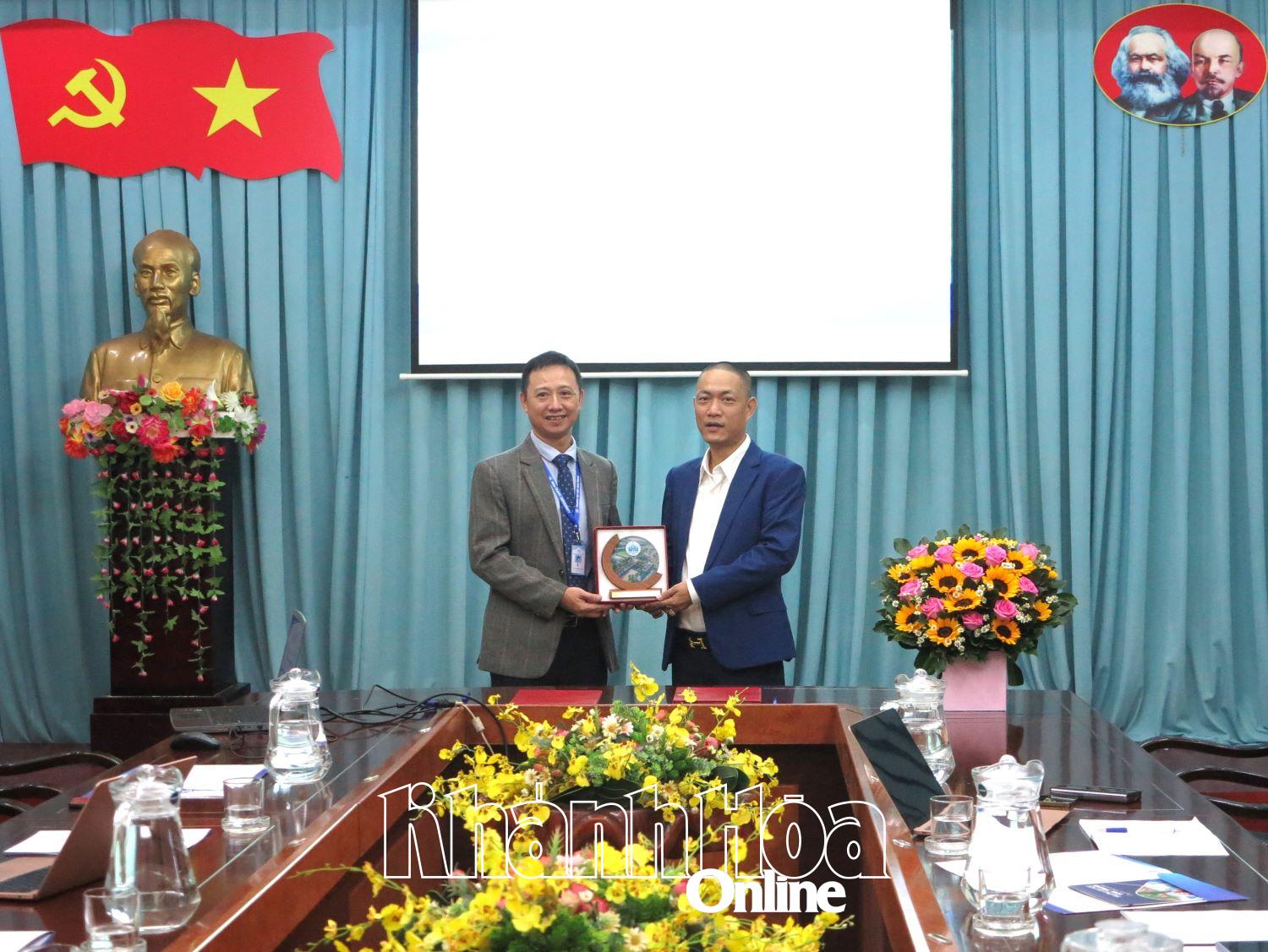 | Lãnh đạo Trường Đại học Nha Trang tặng quà lưu niệm cho Công ty Cổ phần Dịch vụ Công nghệ Sài Gòn. |