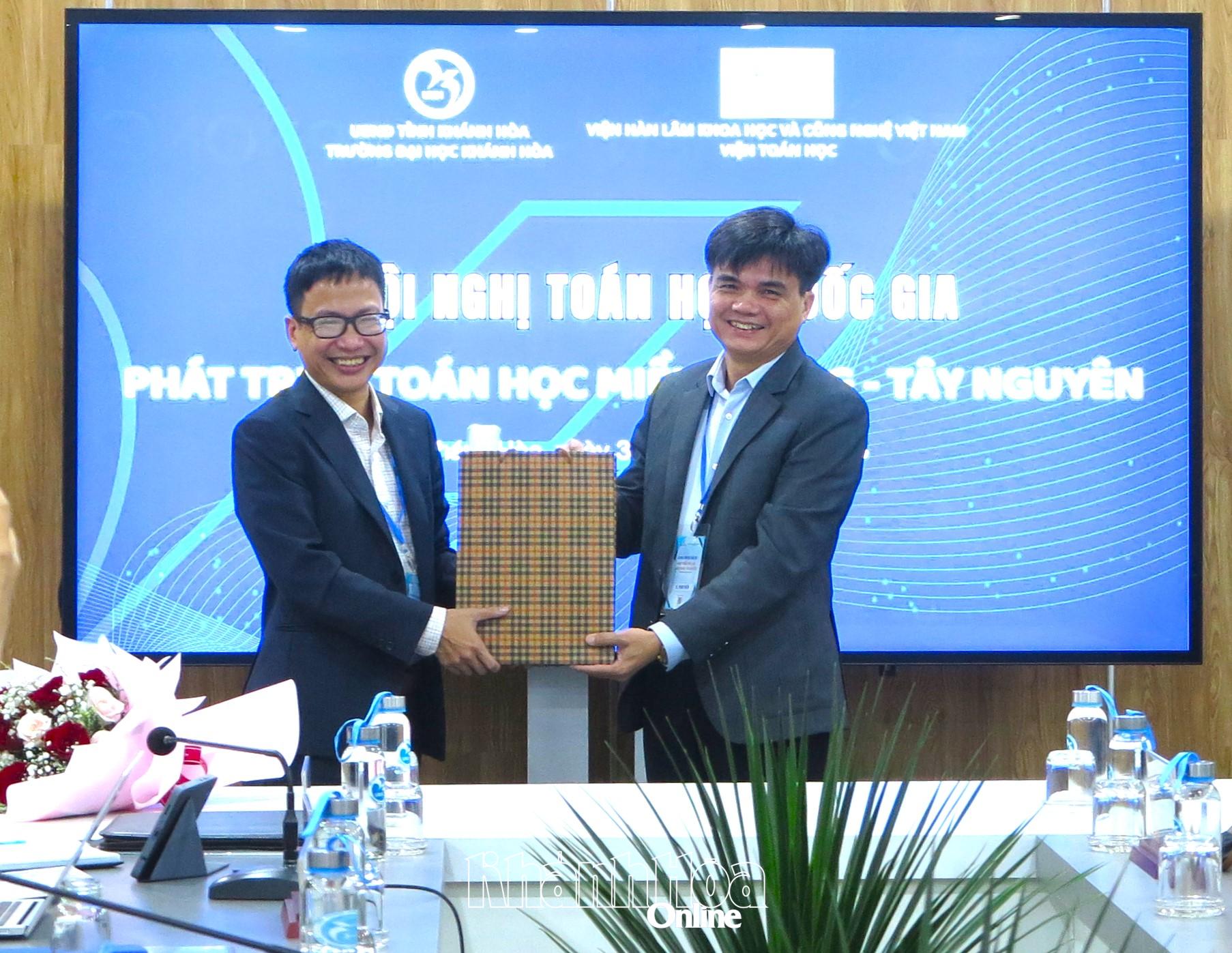 | Giáo sư, Tiến sĩ khoa học Đoàn Thái Sơn - Viện trưởng Viện Toán học tặng quà cho lãnh đạo Trường Đại học Khánh Hòa. |