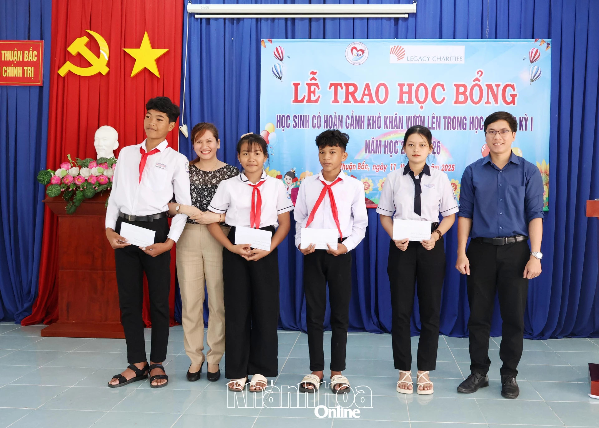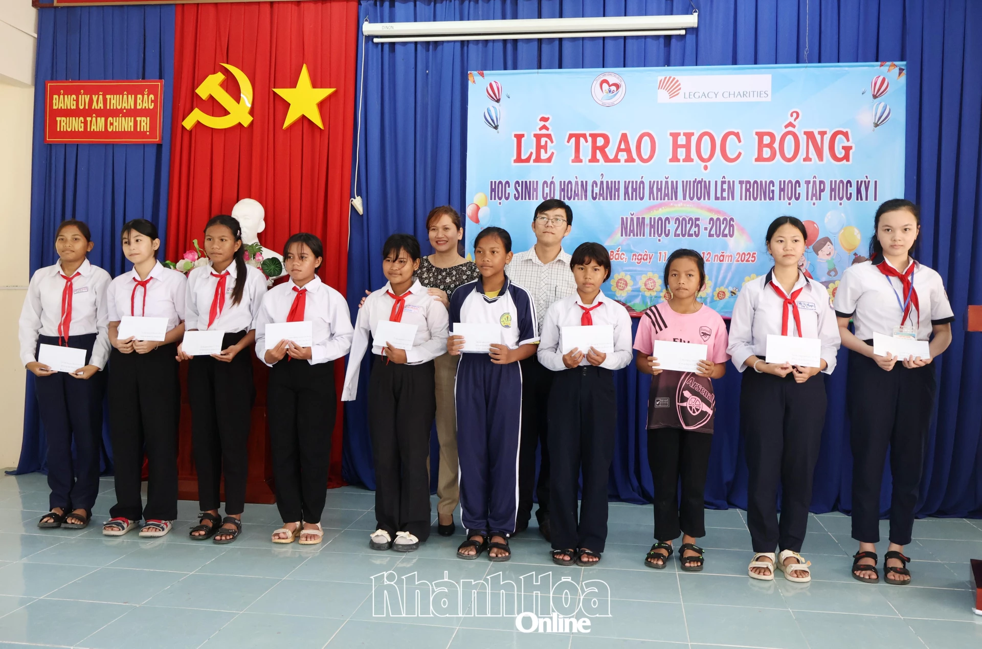Tại buổi lễ, đại diện Tổ chức Legacy Charities tại Việt Nam, Ban Quản lý phi dự án, Trung tâm Công tác xã hội Ninh Thuận và UBND xã Thuận Bắc đã trao 25 suất học bổng cho các học sinh có hoàn cảnh khó khăn vươn lên trong học tập học kỳ I, năm học 2025 - 2026 trên địa bàn xã. Mỗi suất học bổng trị giá 1,25 triệu đồng, do Tổ chức Legacy Charities (Hoa Kỳ) tài trợ.
