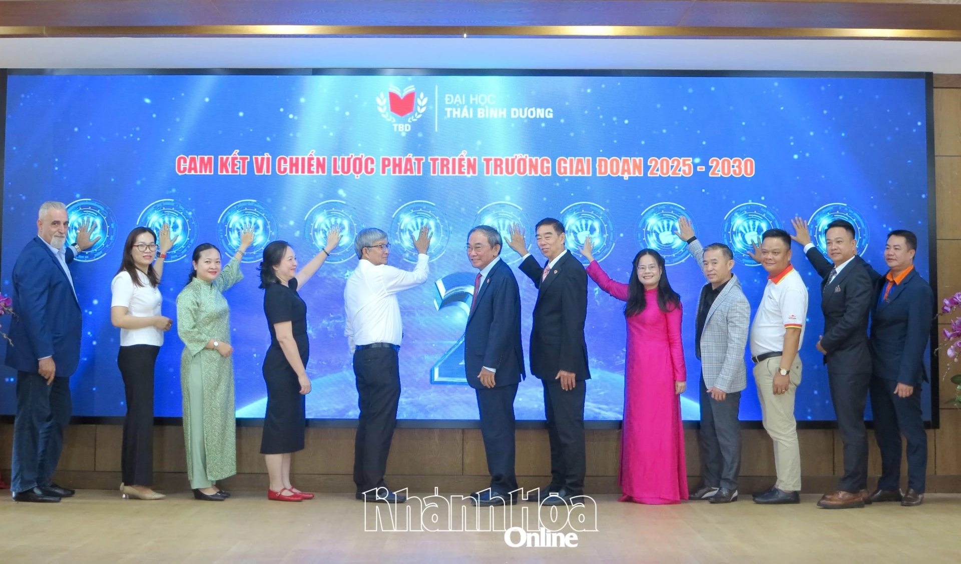 | Đại diện các đơn vị thực hiện nghi thức cam kết đồng hành thực hiện chiến lược phát triển Trường Đại học Thái Bình Dương giai đoạn 2025 - 2030. |