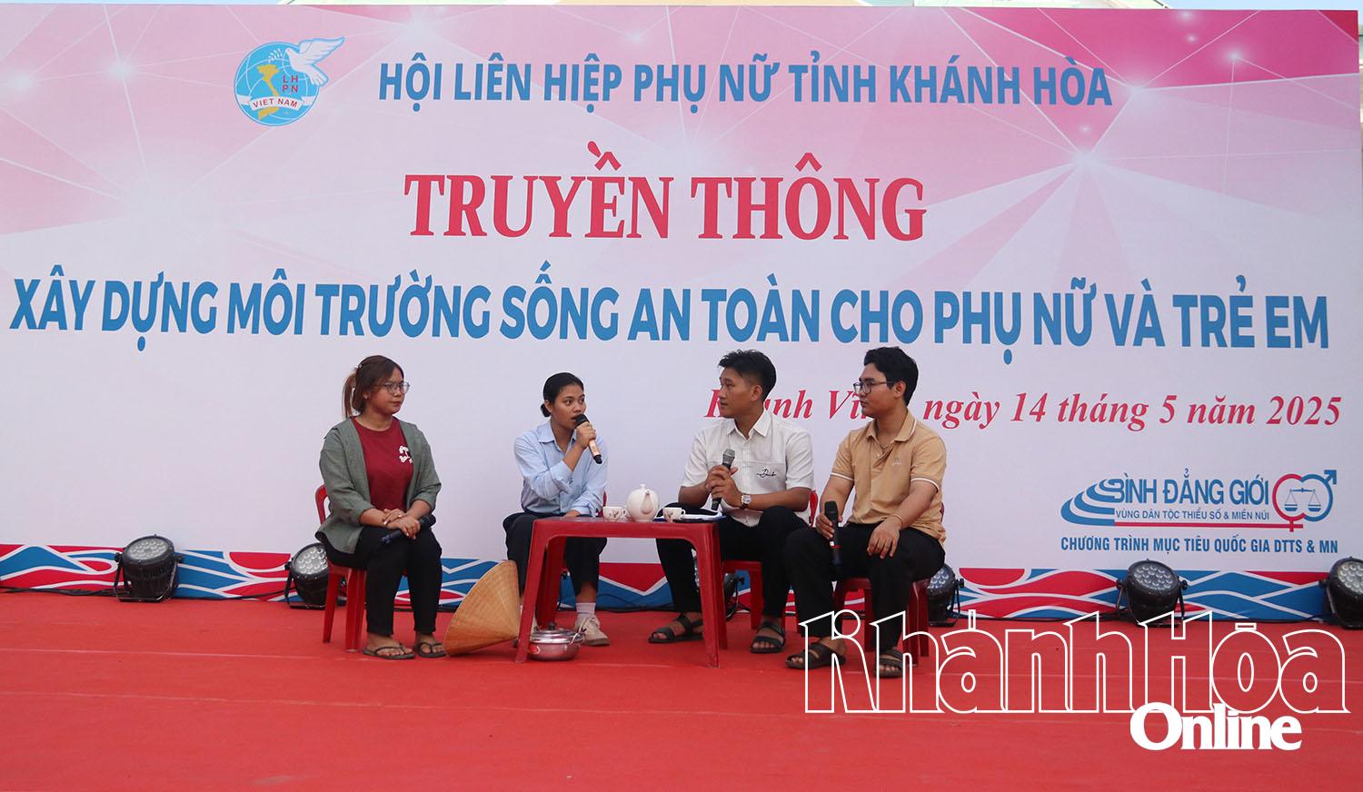 Tại chương trình, Hội LHPN tỉnh tổ chức truyền thông bằng hình thức sân khấu hóa với sự tham gia của 8 đội đến từ Hội LHPN các xã, thị trấn trên địa bàn huyện Khánh Vĩnh. Các đội đã truyền tải nhiều nội dung về phòng, chống bạo lực gia đình; phòng, chống tảo hôn và hôn nhân cận huyết thống; bình đẳng giới… thông qua các tiết mục như: Chuyện xóm tôi, Thức tỉnh, Ngăn chặn kịp thời, Bình đẳng giới, Con ong và con bướm, Giấc mơ tan vỡ, Hãy hành động vì 1 gia đình không có bạo lực, A ma biết rồi.
