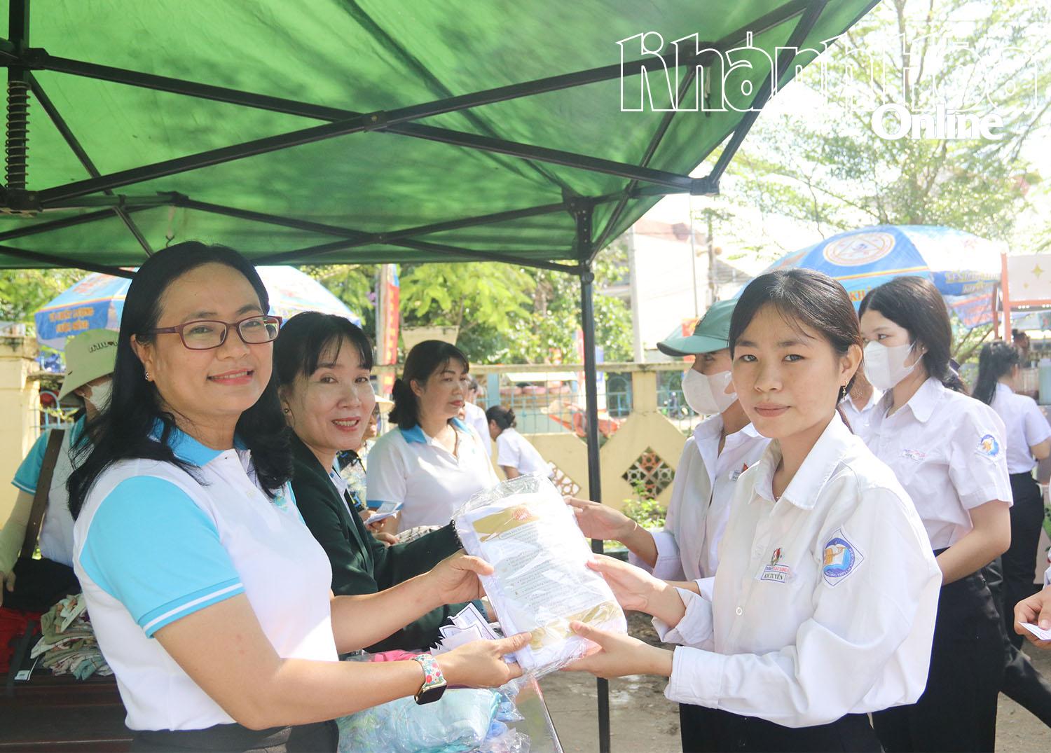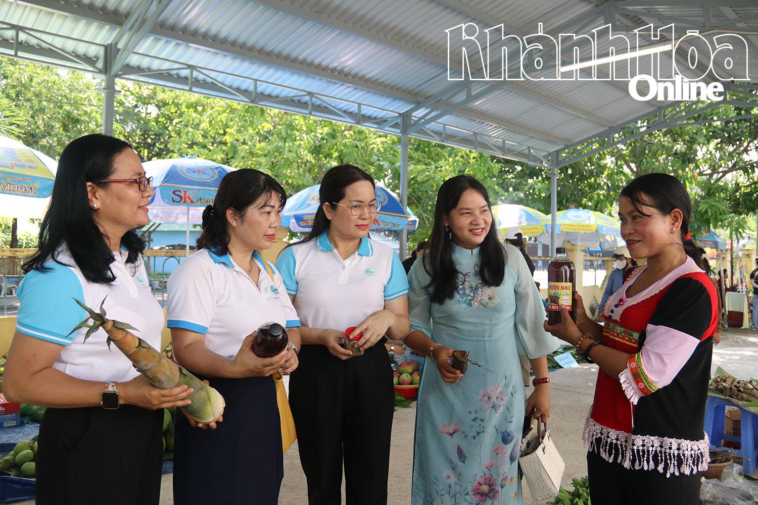 Cùng với đó, Hội LHPN tỉnh tổ chức phiên chợ quê với 30 gian hàng giới thiệu, trưng bày các nông sản địa phương; sản phẩm truyền thống của đồng bào dân tộc thiểu số; sản phẩm của hội viên phụ nữ các địa phương, các tổ hợp tác, tổ liên kết, sản phẩm khởi nghiệp, khởi sự kinh doanh của phụ nữ. Các mặt hàng được bày bán tại phiên chợ gồm: Trái cây, bánh, rau, măng, mật ong, bắp, khoai mì, đậu đen xanh lòng… Các gian hàng thực hiện hạn chế sử dụng túi ni lông và đồ nhựa dùng một lần; có triển khai thanh toán bằng quét mã QR. Ngoài ra, Hội LHPN tỉnh còn tổ chức gian hàng 0 đồng với hơn 1.000 sản phẩm gồm: Vải, quần áo, áo dài do các mạnh thường quân, nhà hảo tâm tài trợ để tặng cho học sinh, hội viên phụ nữ có hoàn cảnh khó khăn trên địa bàn huyện Khánh Vĩnh.