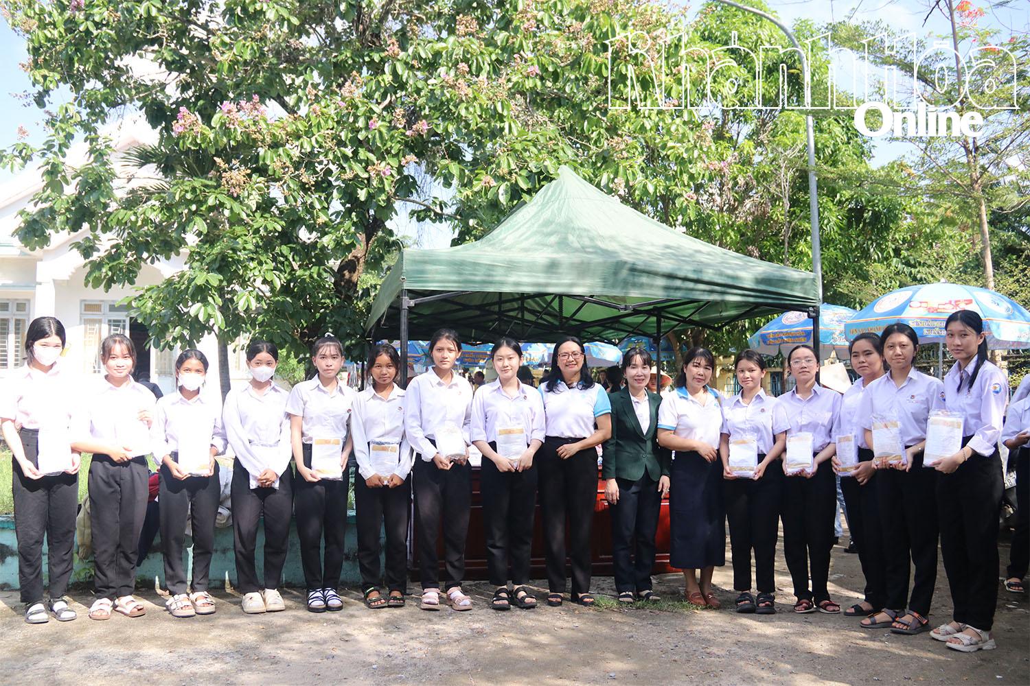 | Lãnh đạo Hội Liên hiệp Phụ nữ tỉnh trao áo dài cho học sinh có hoàn cảnh khó khăn. |