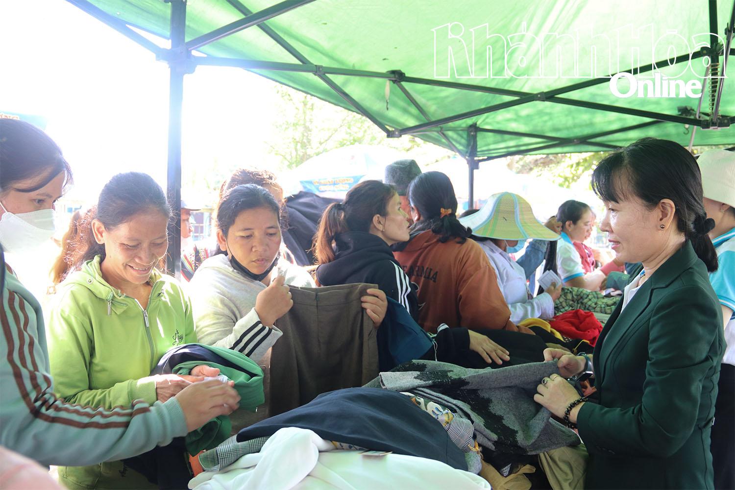 | Phụ nữ có hoàn cảnh khó khăn trên địa bàn huyện Khánh Vĩnh lựa chọn quần áo tại gian hàng 0 đồng. |