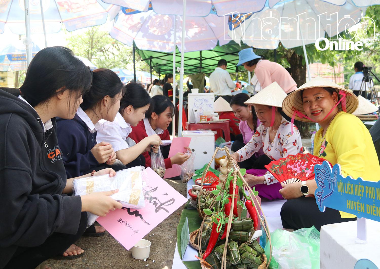 | Học sinh mua sản phẩm tại gian hàng của phụ nữ huyện Diên Khánh. |