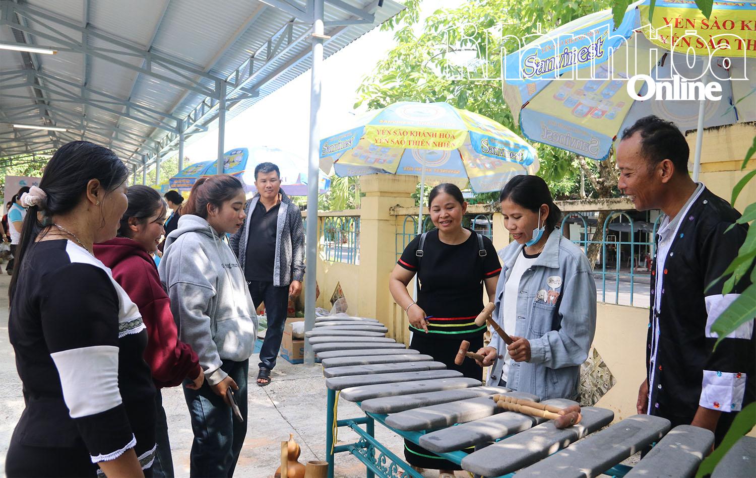 | Người dân tham quan và học cách đánh đàn đá. |