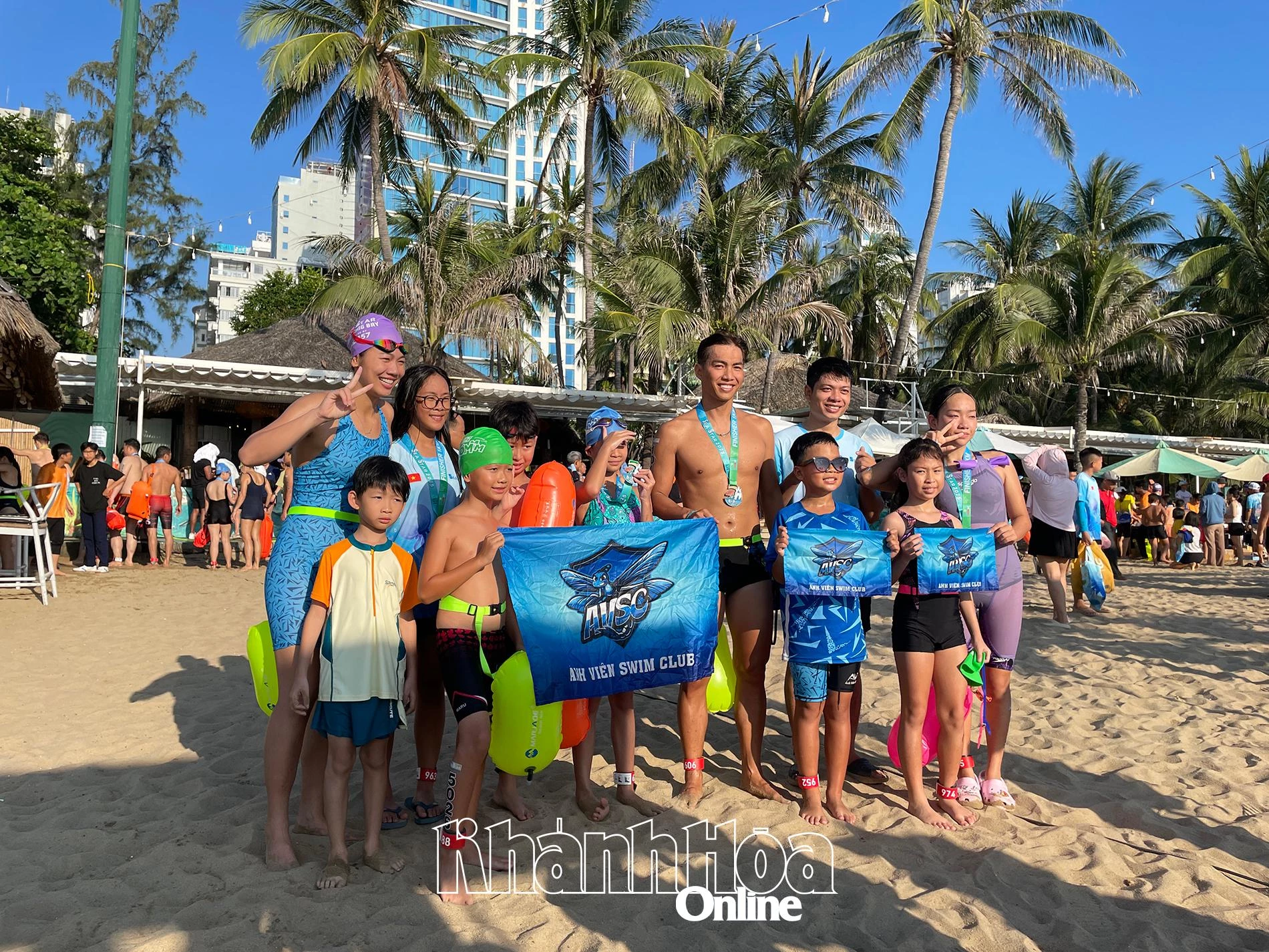| Ánh Viên chụp ảnh với các học trò trong chuyến ra Nha Trang thi đấu. |