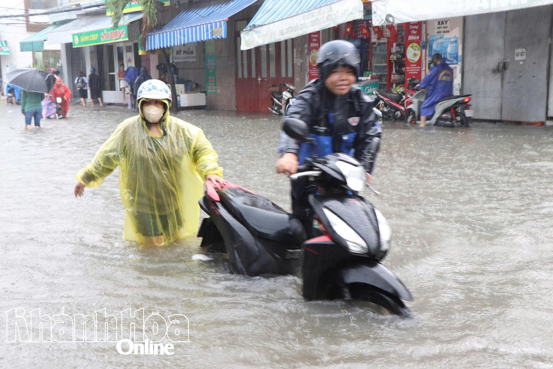 | Đường Nguyễn Khuyến (phường Bắc Nha Trang) bị ngập sâu. Người đi đường phải dắt bộ xe máy |