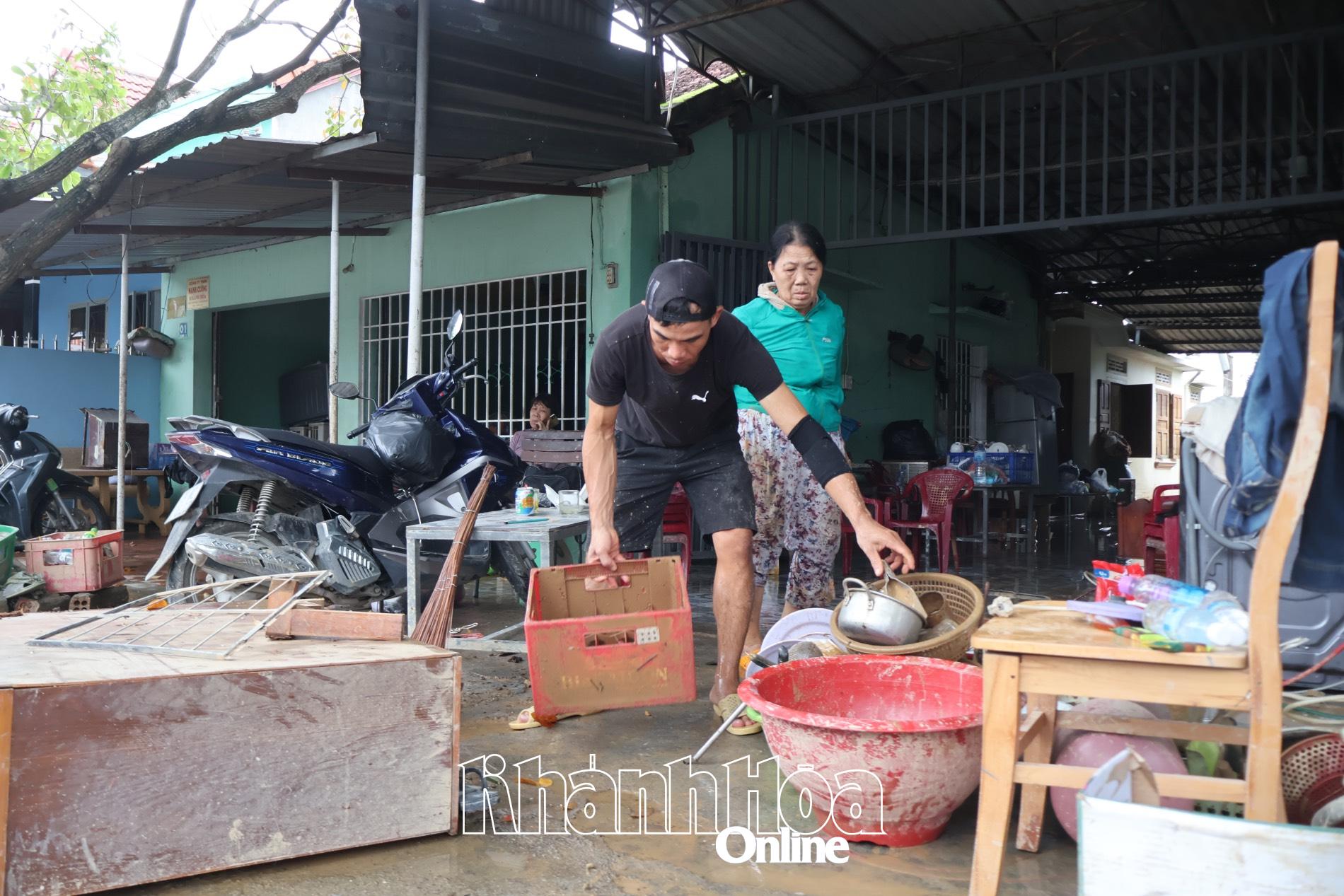 | Người dân xã Diên Điền dọn dẹp các vật dụng sau mưa lũ. |