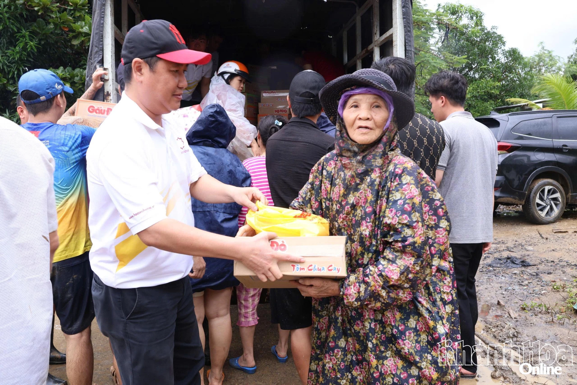 | Đoàn cứu trợ của Tập đoàn Hoa Sen tặng nhu yếu phẩm cho người dân xã Diên Điền. |