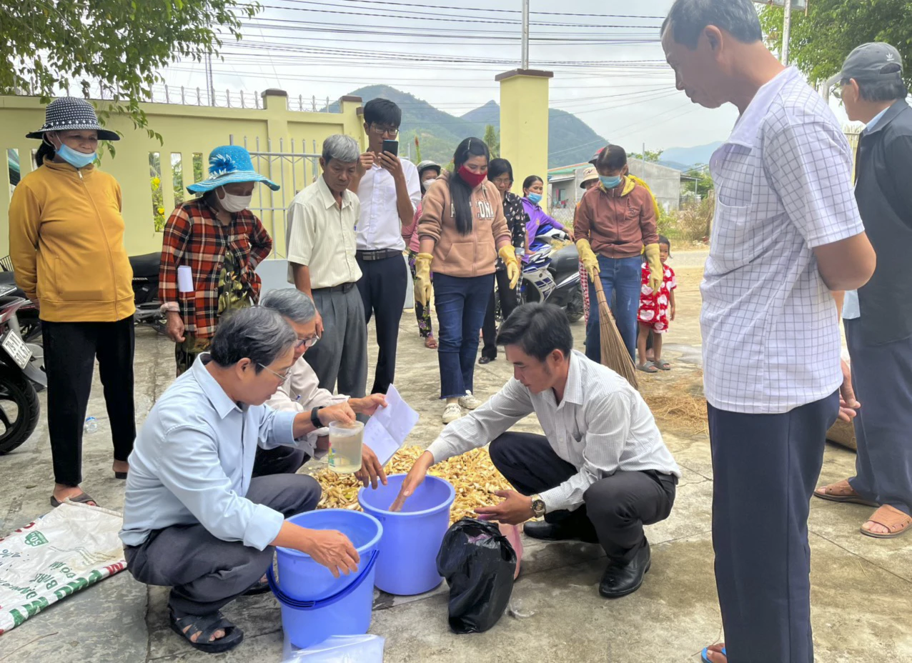 | Nông dân thực hành lên men phụ phẩm cây trồng làm thức ăn chăn nuôi. |