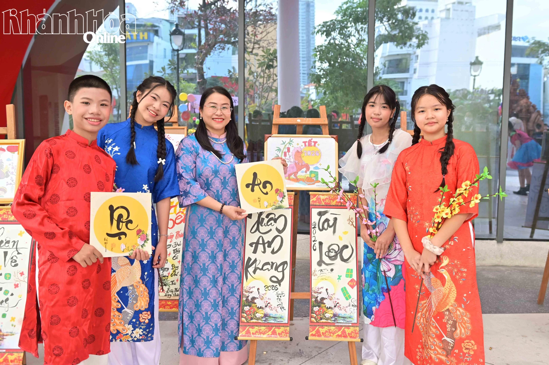 | Gian hàng thư pháp được nhiều em nhỏ thích thú đến xin chữ. |