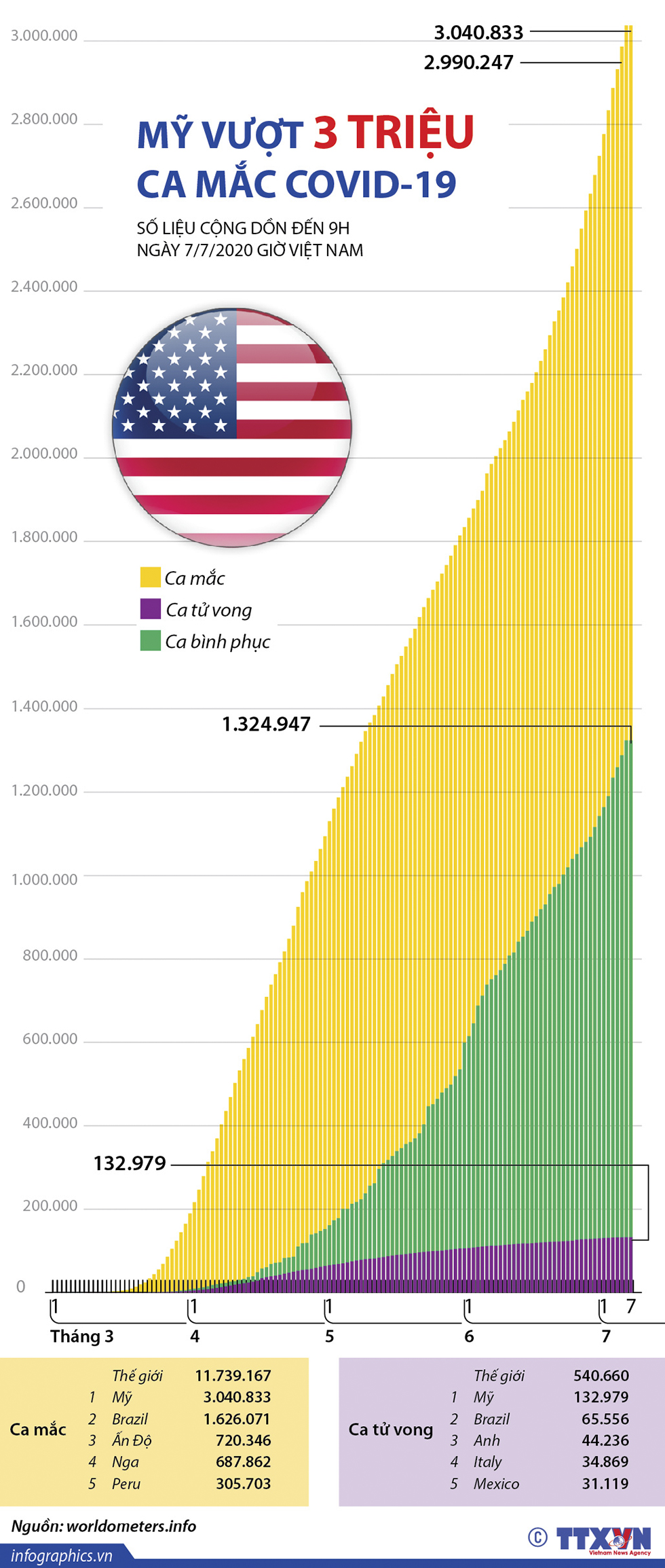 Mỹ vượt 3 triệu ca mắc COVID-19 (đến 9h ngày 7/7/2020 giờ Việt Nam)