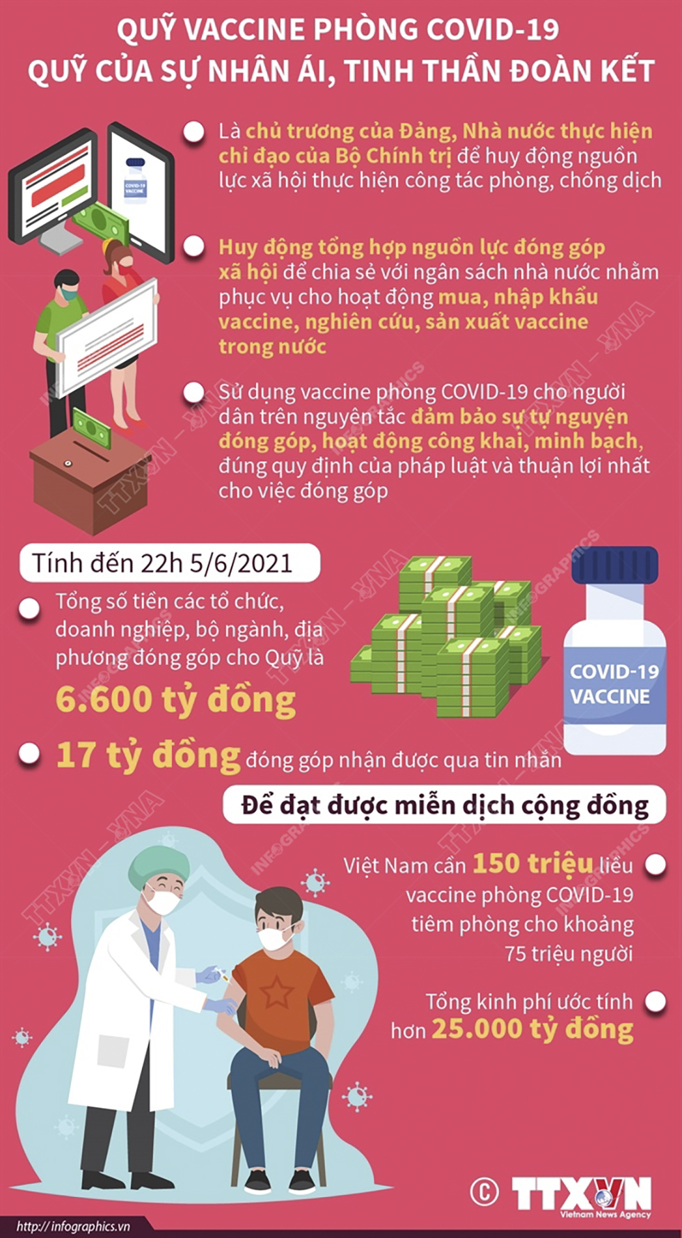 Tại lễ ra mắt Quỹ vaccine phòng COVID-19 tối 5/6/2021, Thủ tướng Chính phủ Phạm Minh Chính xúc động nói: Quỹ vaccine là quỹ của sự nhân ái, của tinh thần đoàn kết, của niềm tin, của trái tim kết nối trái tim để chúng ta cùng nhau vượt qua khó khăn, góp phần tạo nên một Việt Nam chiến thắng, để một lần nữa chúng ta lại ghi danh, viết nên lịch sử chiến thắng vẻ vang của dân tộc - chiến thắng đại dịch COVID-19.