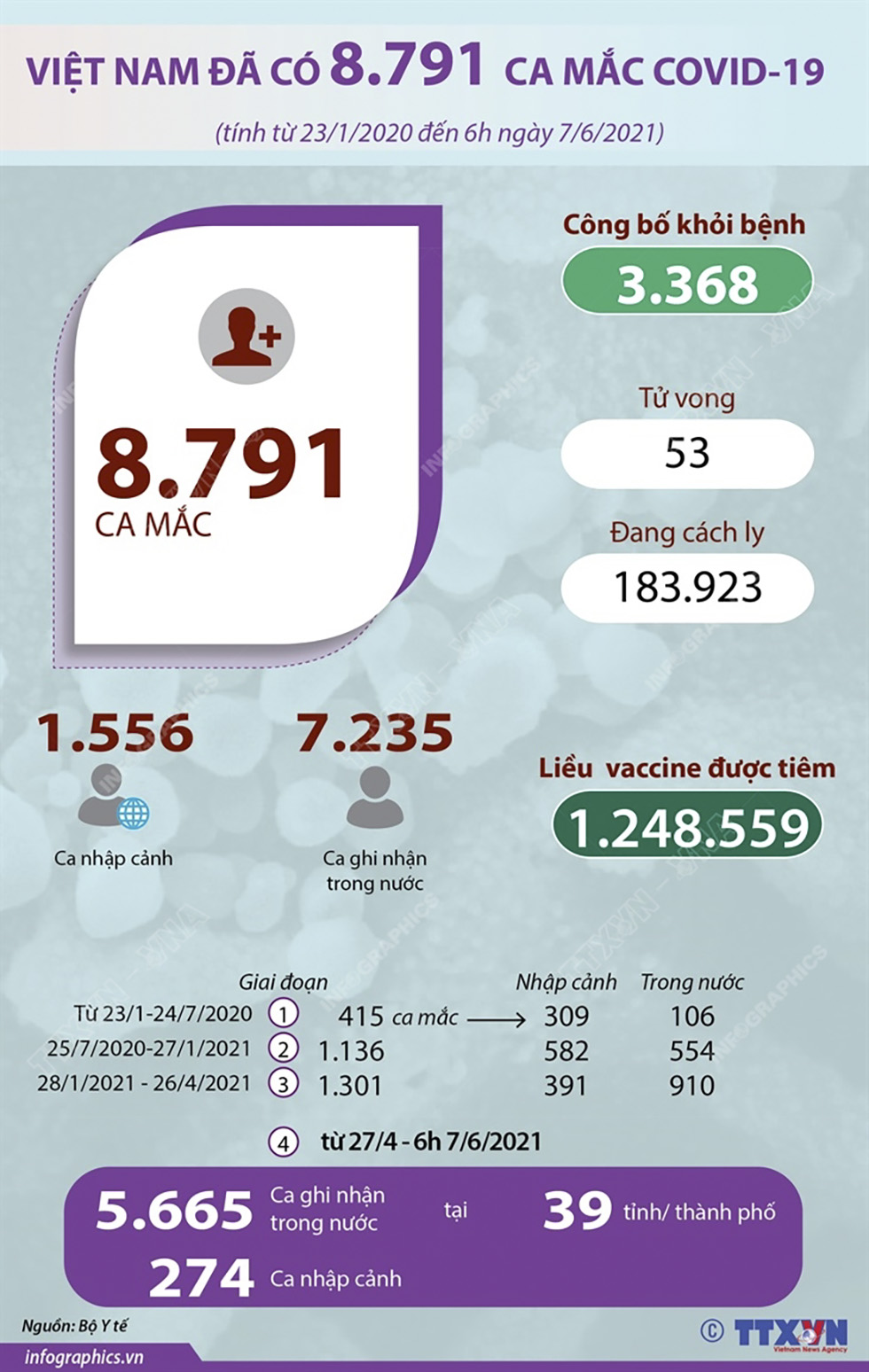 Tính từ 23/1/2020 đến 6h ngày 7/6/2021, Việt Nam đã có 8.791 ca mắc COVID-19.