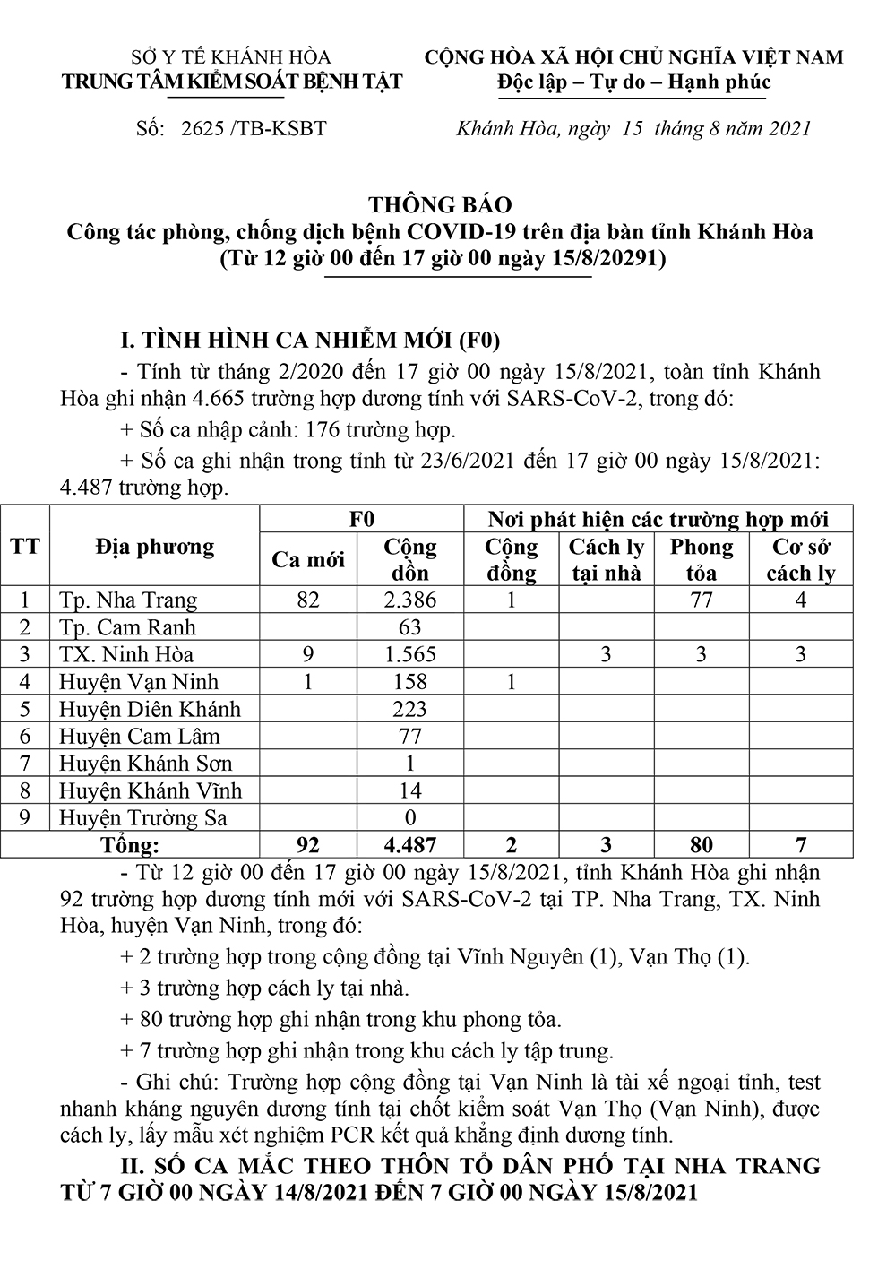Chiều 15-8, theo Trung tâm Kiểm soát bệnh tật tỉnh Khánh Hòa, từ 12 giờ đến 17 giờ cùng ngày, toàn tỉnh ghi nhận thêm 92 ca dương tính với SARS-CoV-2.