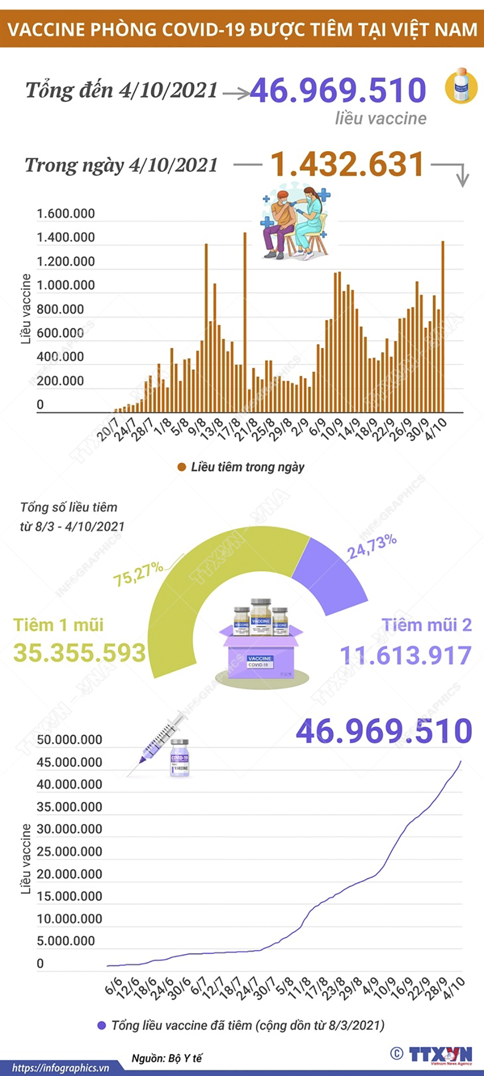 Trong ngày 4/10/2021 có 1.432.631 liều vaccine phòng COVID-19 được tiêm. Như vậy, tổng số liều vaccine đã được tiêm tại Việt Nam là 46.969.510 liều, trong đó tiêm 1 mũi là 35.355.593 liều, tiêm mũi 2 là 11.613.917