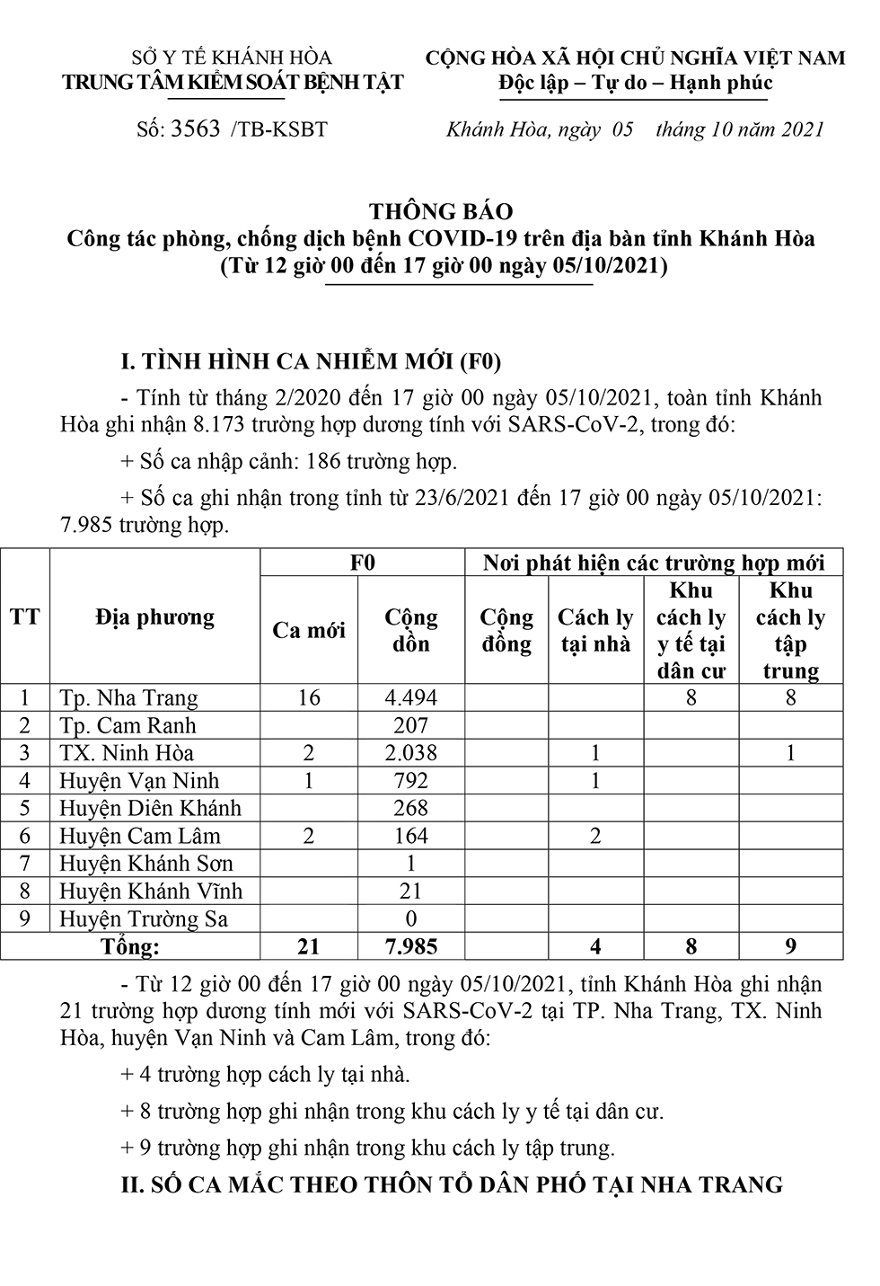 Chiều 5-10, theo Trung tâm Kiểm soát bệnh tật tỉnh Khánh Hòa, từ 12 giờ đến 17 giờ cùng ngày, toàn tỉnh ghi nhận thêm 21 ca dương tính với SARS-CoV-2.