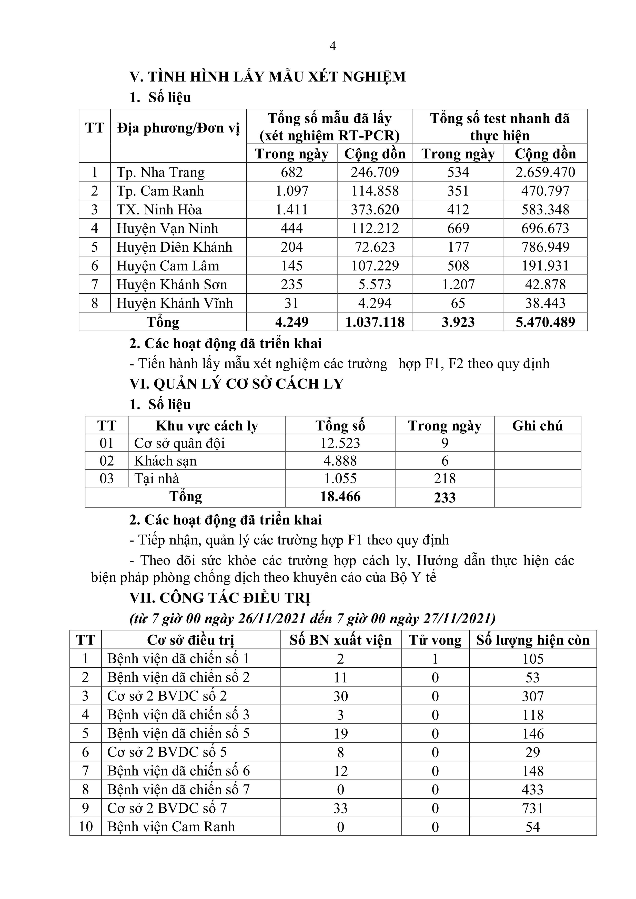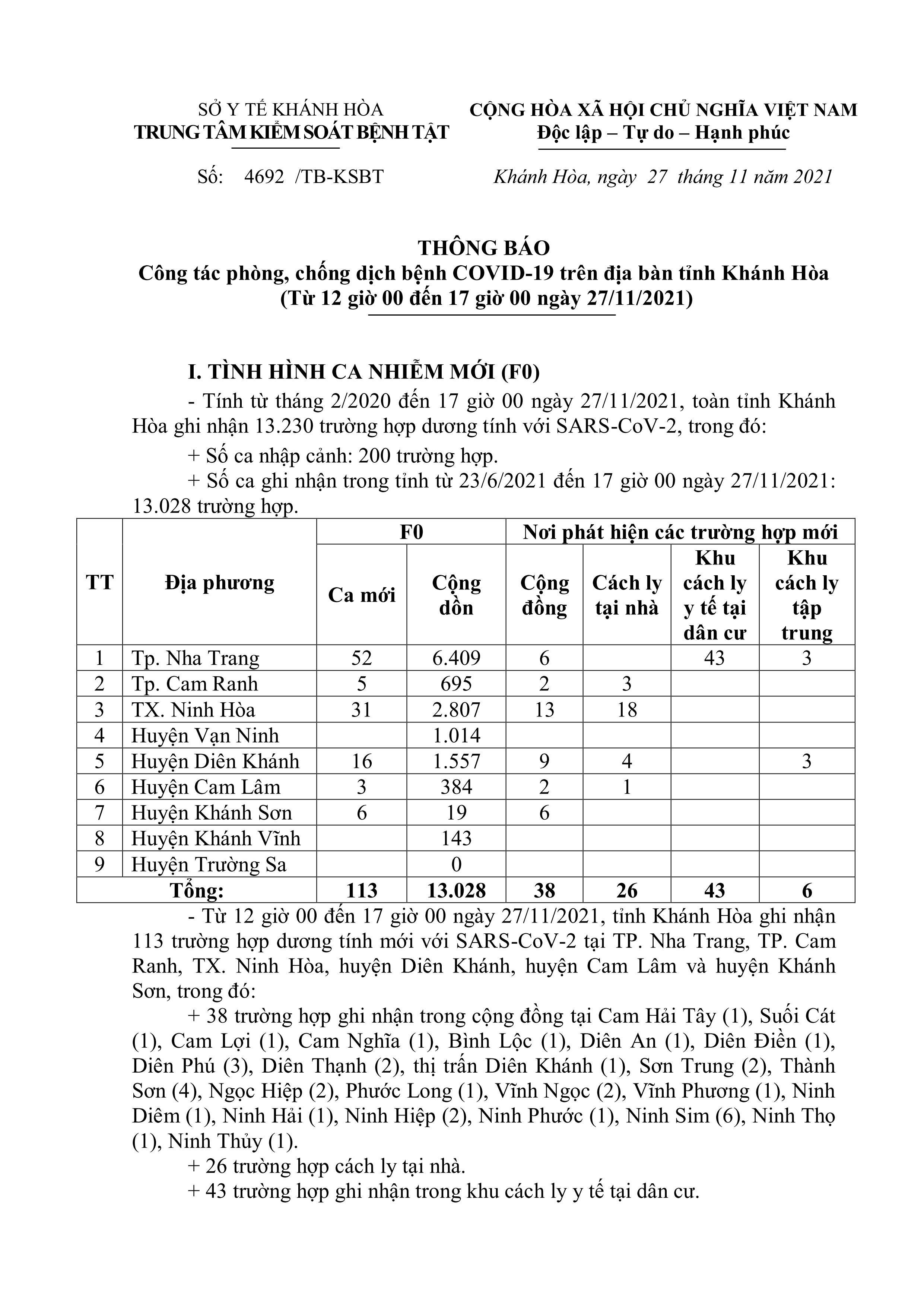 Chiều 27-11, theo Trung tâm Kiểm soát bệnh tật tỉnh Khánh Hòa, từ 12 giờ đến 17 giờ ngày 27-11, toàn tỉnh ghi nhận thêm 113 ca dương tính với SARS-CoV-2.