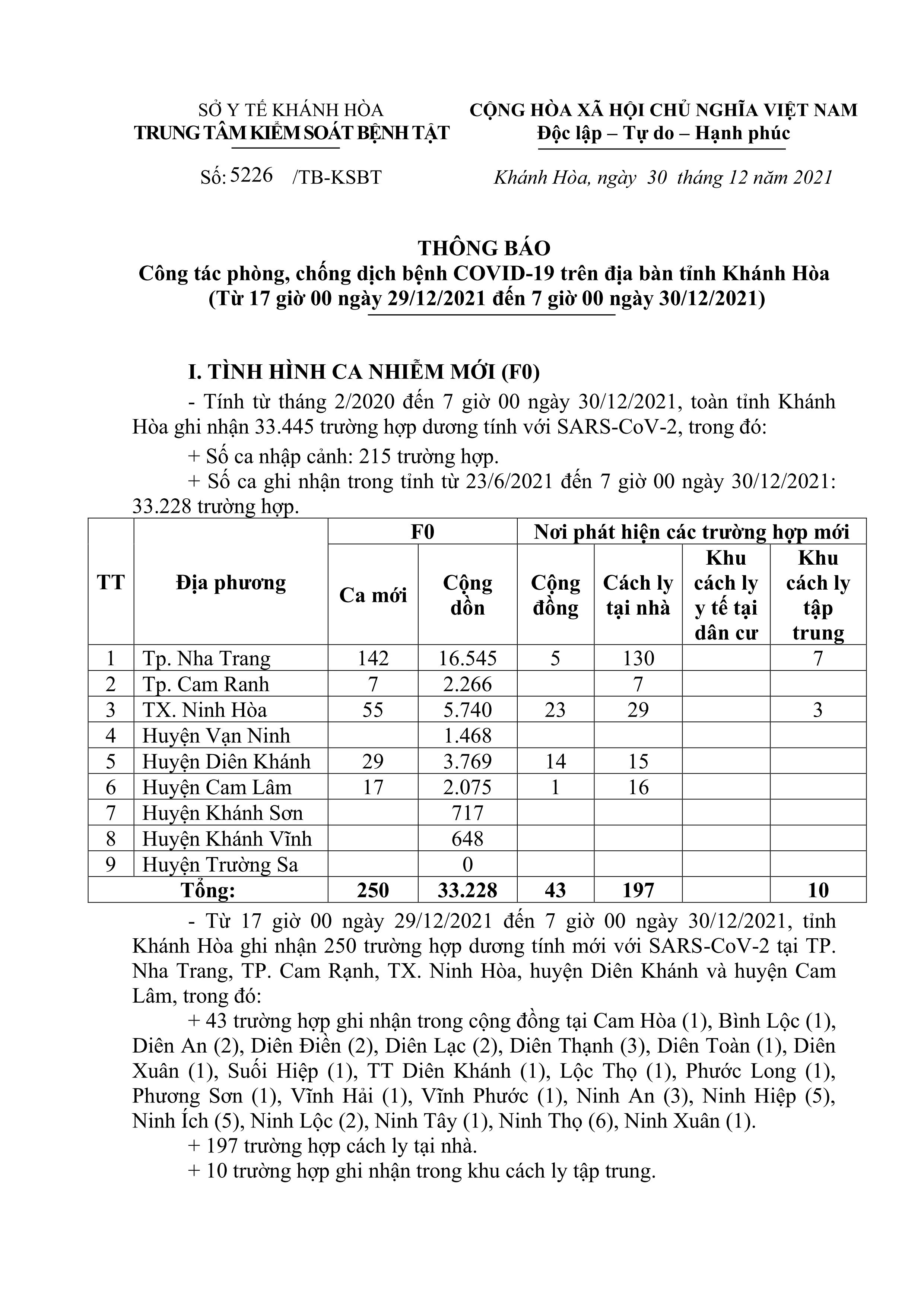 Sáng 30-12, theo Trung tâm Kiểm soát bệnh tật tỉnh Khánh Hòa, từ 17 giờ ngày 29-12 đến 7 giờ ngày 30-12, toàn tỉnh ghi nhận thêm 250 ca dương tính với SARS-CoV-2.