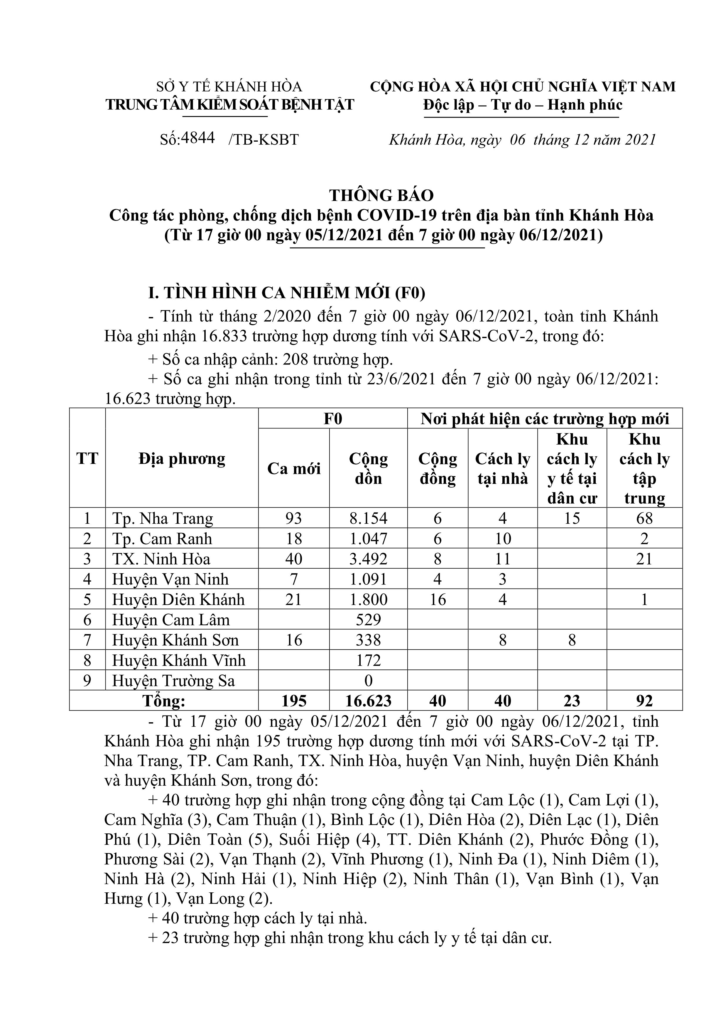 Sáng 6-12, theo Trung tâm Kiểm soát bệnh tật tỉnh Khánh Hòa, từ 17 giờ ngày 5-12 đến 7 giờ ngày 6-12, toàn tỉnh ghi nhận thêm 195 ca dương tính với SARS-CoV-2.