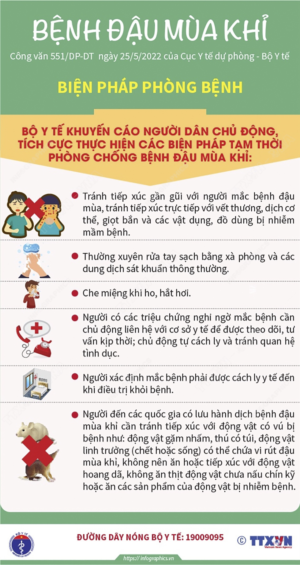Bộ Y tế khuyến cáo người dân chủ động, tích cực thực hiện các biện pháp tạm thời phòng chống bệnh Đậu mùa khỉ như: Tránh tiếp xúc gần gũi với người mắc bệnh đậu mùa, tránh tiếp xúc trực tiếp với vết thương, dịch cơ thể, giọt bắn và các vật dụng...