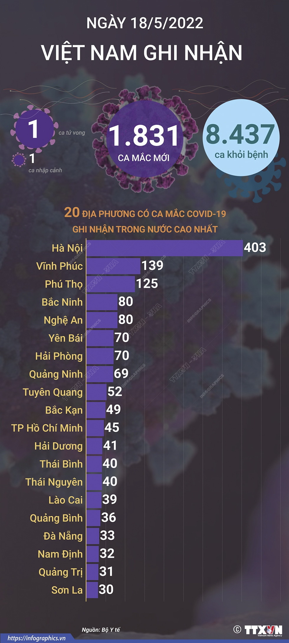 Theo Bộ Y tế, tính từ 16h ngày 17/5 đến 16h ngày 18/5/2022, Việt Nam ghi nhận 1.831 ca mắc mới COVID-19 tại 48 tỉnh, thành phố, 1 ca tử vong do COVID-19, Hà Nội ghi nhận 403 ca, Vĩnh Phúc 139 ca, Phú Thọ 125 ca, Bắc Ninh 80 ca, Nghệ An 80 ca...