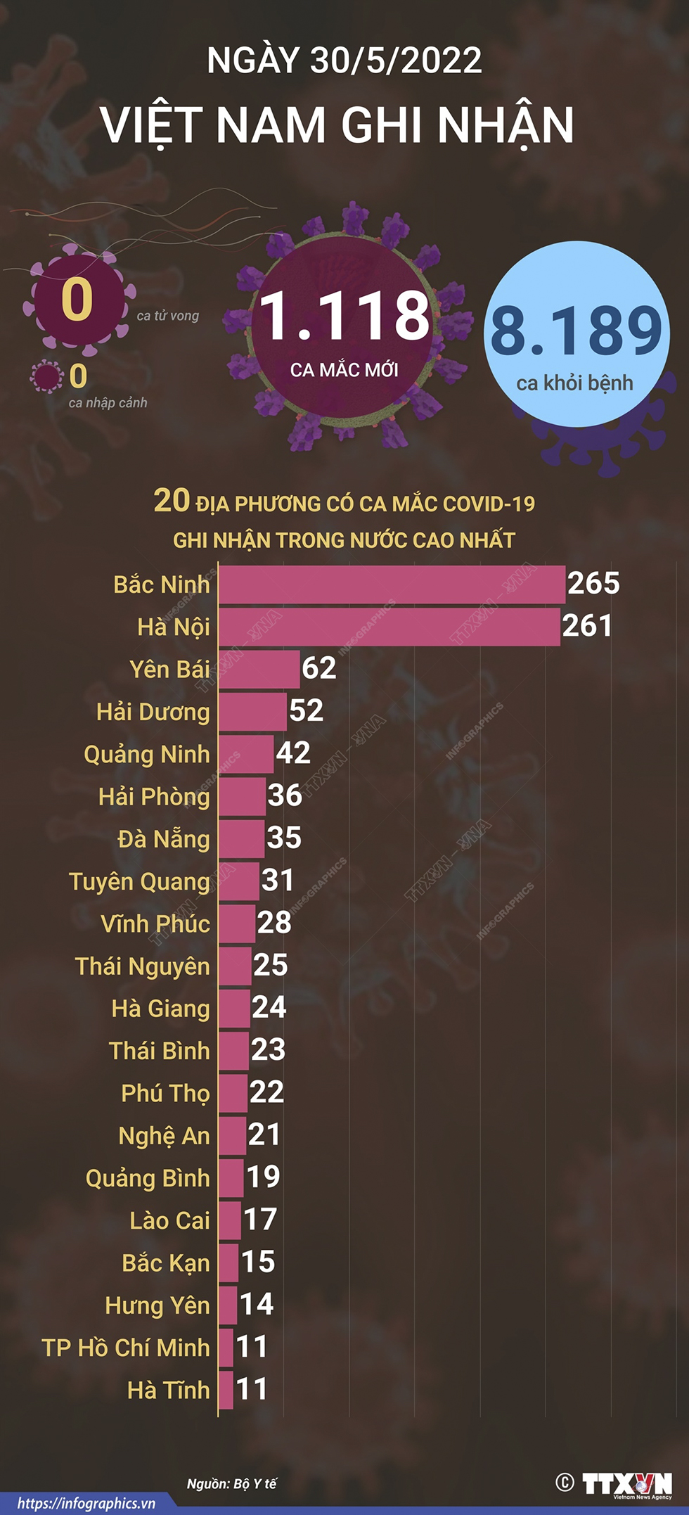Theo Bộ Y tế, tính từ 16h ngày 29/5 đến 16h ngày 30/5/2022, Việt Nam ghi nhận 1.118 ca mắc mới COVID-19 tại 45 tỉnh, thành phố, 0 ca tử vong do COVID-19, Bắc Ninh ghi nhận 265 ca, Hà Nội 261 ca, Yên Bái 62 ca, Hải Dương 52 ca, Quảng Ninh 42 ca...