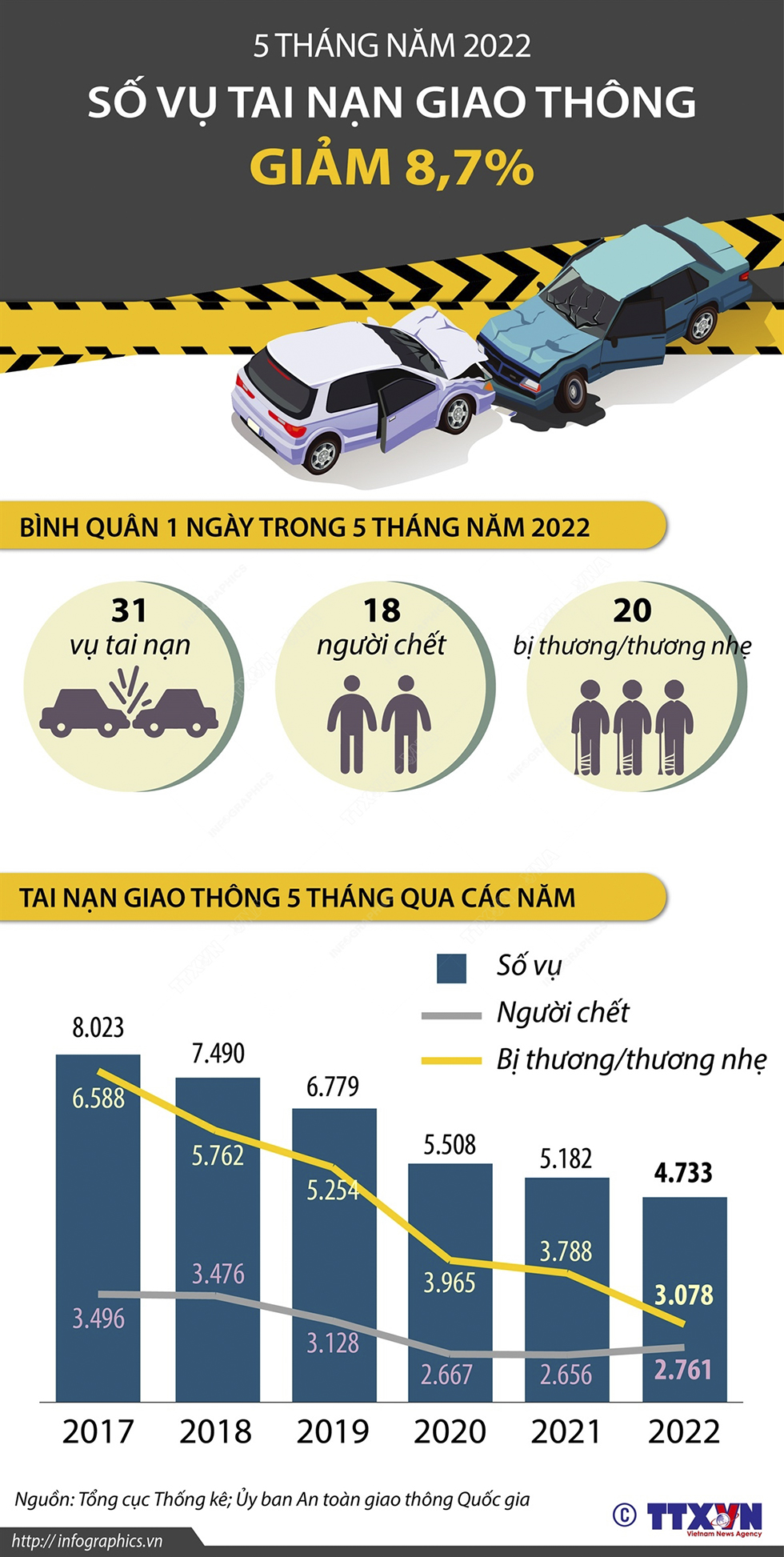 5 tháng năm 2022, trên địa bàn cả nước xảy ra 4.733 vụ tai nạn giao thông, làm 2.761 người chết, 3.078 người bị thương. So với cùng kỳ năm 2021, số vụ tai nạn giao thông trong 5 tháng năm 2022 giảm 8,7%.