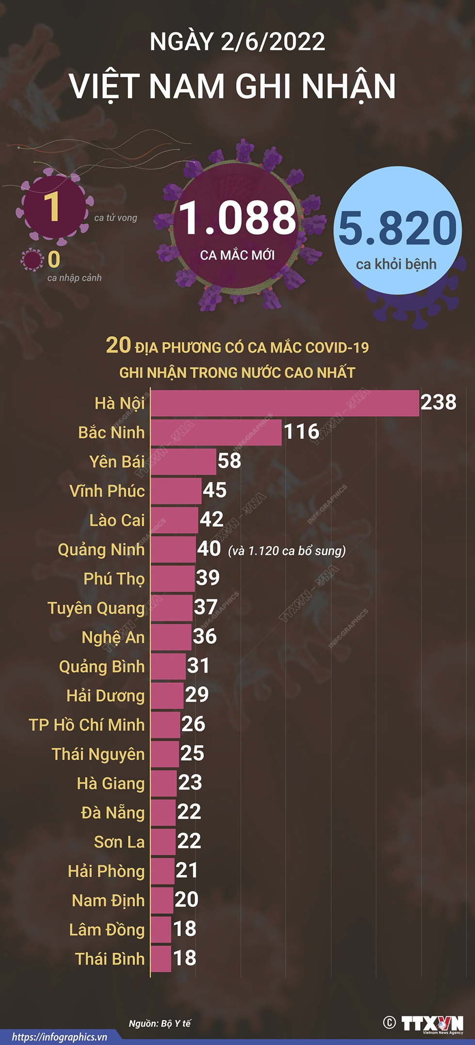 Theo Bộ Y tế, tính từ 16h ngày 1/6 đến 16h ngày 2/6/2022, Việt Nam ghi nhận 1.088 ca mắc mới COVID-19 tại 46 tỉnh, thành phố, 1 ca tử vong do COVID-19, Hà Nội ghi nhận 238 ca, Bắc Ninh 116 ca, Yên Bái 58 ca, Vĩnh Phúc 45 ca, Lào Cai 42 ca...